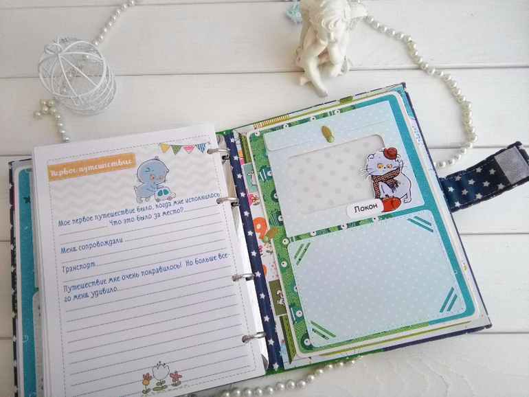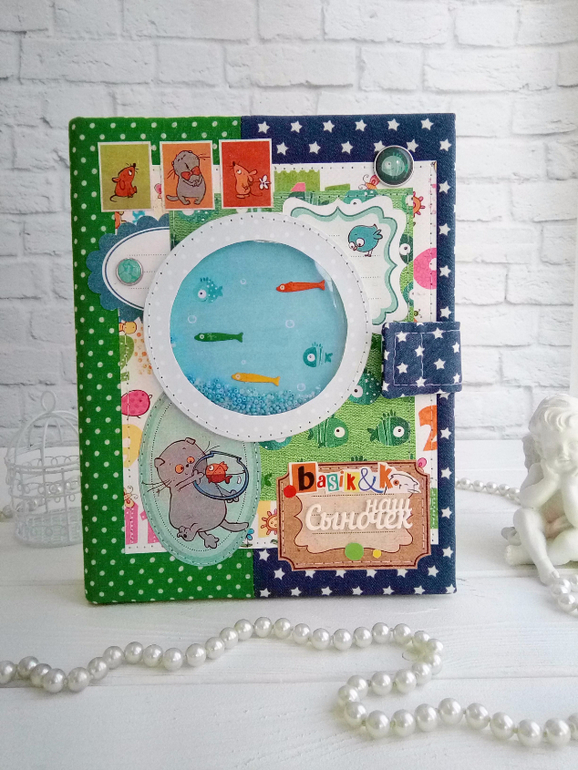 Блокнот для маминых заметок с местом под фото. Оформленные скрап форзацы. Обложка хлопок + джинс. Шейкер в виде аквариума. Выполнен на заказ.