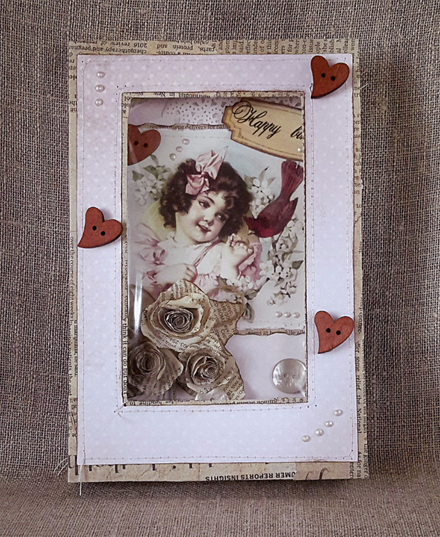Прилагается коробочка с прозрачным окном, также полностью ручной работы, которая предохраняет открытку от деформации.