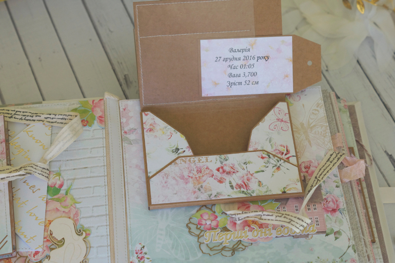 На первом развороте расположена коробочка для прищепки от пупочка, бирочки с роддома и теста на беременность, там же есть тег с метрикой малышки. На страничках фотоальбома Вы найдете конверты для зубчика, и для локона. Есть карточки для отпечатков ножки и ладошки, ну и как же без карточек, на которых мамочка сможет записывать данные о весе и росте крошки. Вообщем в этом фотоальбоме будет всё, что хочет сохранить на память каждая мама💗