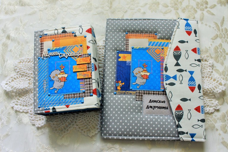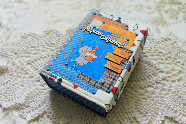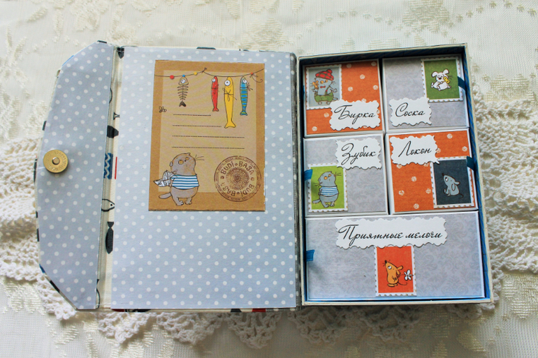 Коробки, шкатулки, комодыСделался мальчуковый набор с моим любимым котом Басиком- папка для детских документов и мамины сокровища. Папка с 2-мя плотными файлами и пластиковым кармашком, закрывается на клапан с магнитной кнопкой. Коробочка закрывается также