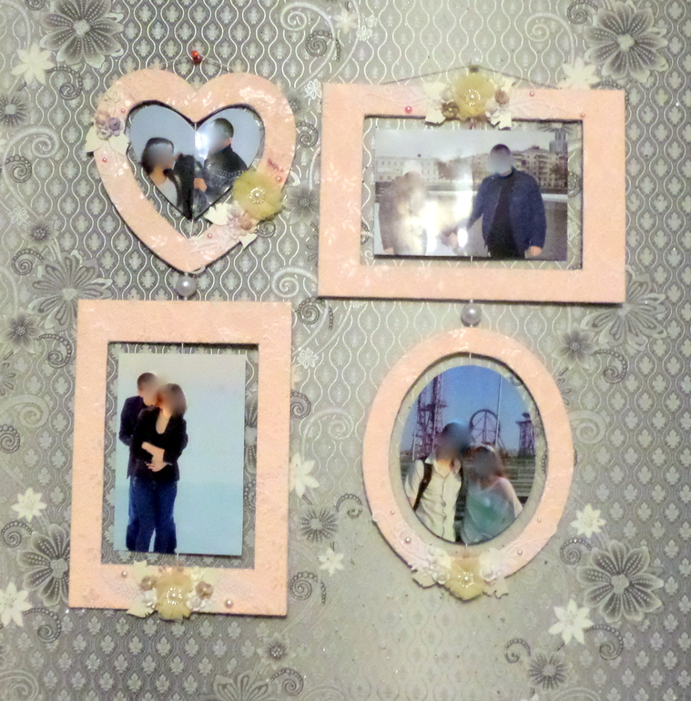 Рамочек всего 18, но, поскольку они двойные, то 36!)) Разных форм и размеров. Задача стояла такая: Нужны рамки для фотогалереи в банкетный зал. Фото должны быть с двух сторон каждой рамочки. Но! Надо сделать так, чтобы потом молодые могли разместить эту галерею на одной из стен своей квартиры. Если сделать рамочку и просто вставить две фотографии "лицом" в разные стороны, то получится, что на стене можно будет видеть только одну часть фото, Если рамочки украшать с двух сторон (чтобы можно было их время от времени переворачивать), то объемный декор не позволит рамочкам прилегать к стене. Поэтому пришло вот такое решение: Фотографии внутри рамочек поворачиваются. Сделала я их из пивного картона (чтобы полегче были), покрасила в персиковый цвет и обтянула кружевом. Цветочки все сделаны мной вручную))