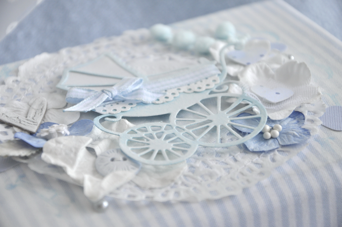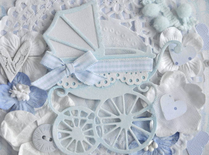 У колясочки белый кожаный "капюшон",чипборд-сердечко украсила кракелюром.
