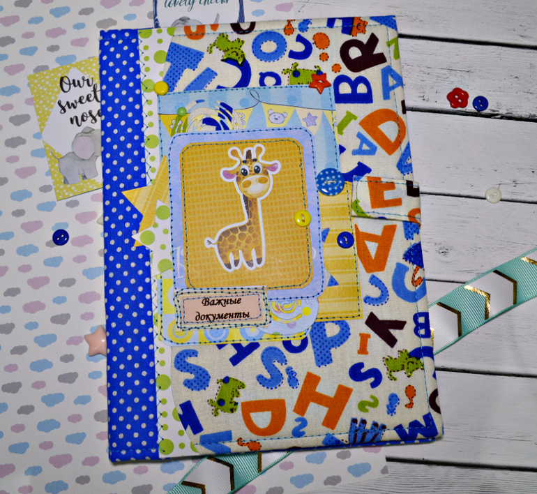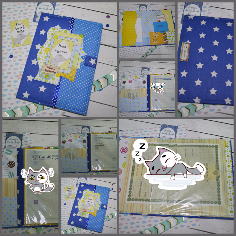 У меня несколько обложек для детских документов. Размер 22х16 см., внутри три разворота и 6 кармашков, куда вместятся все важные документы.