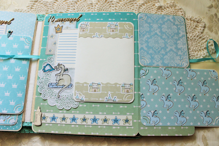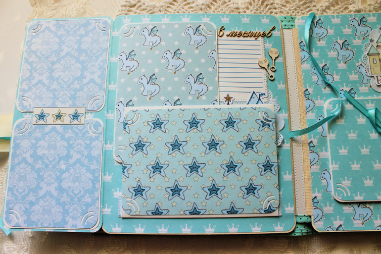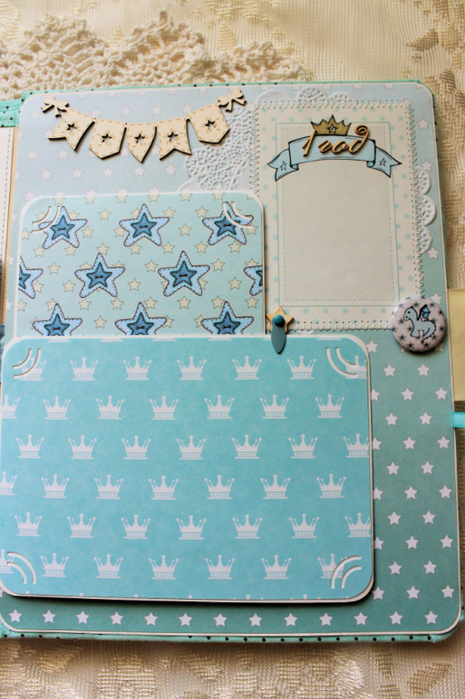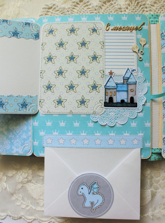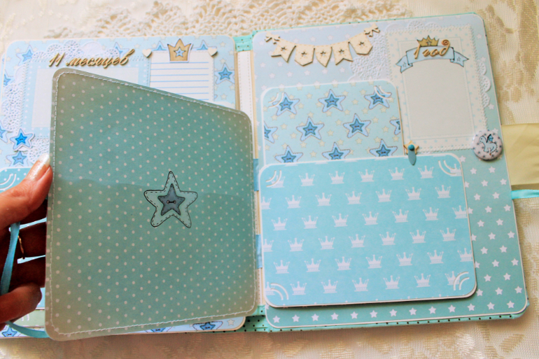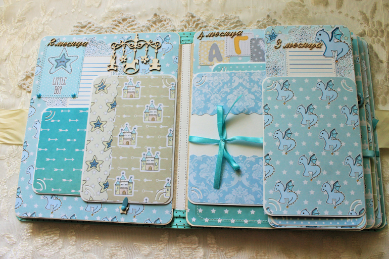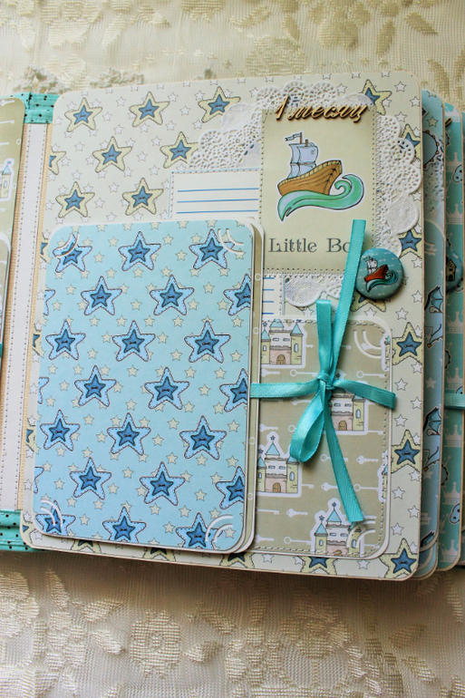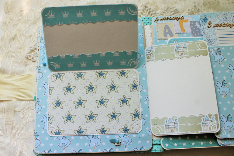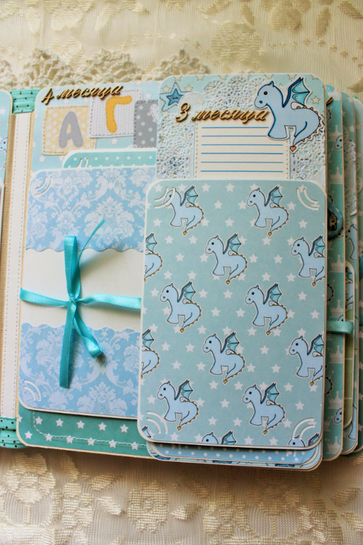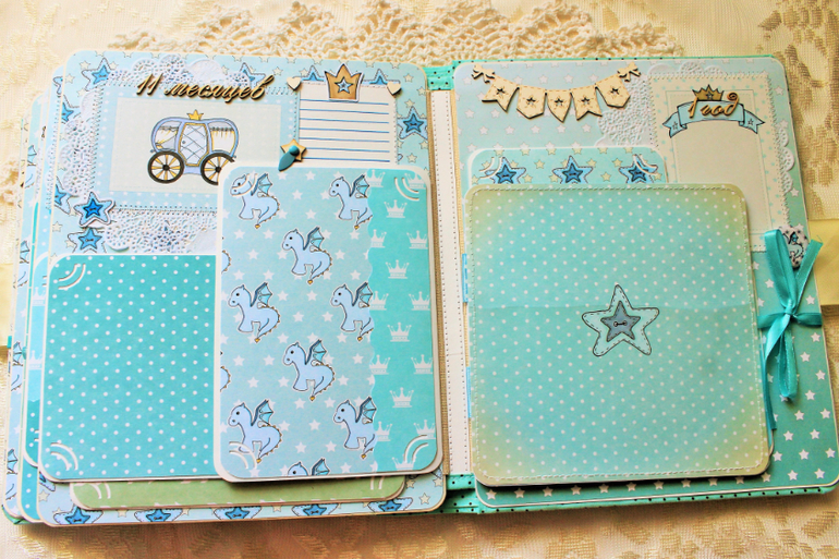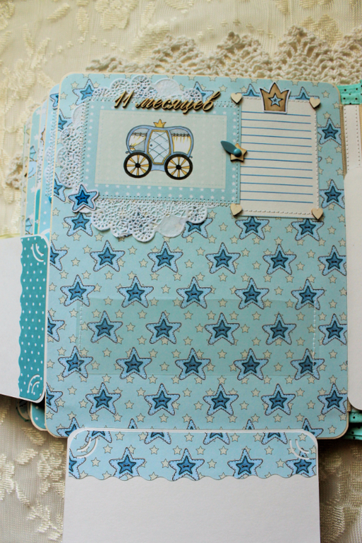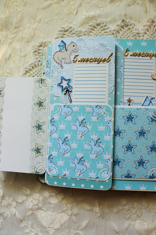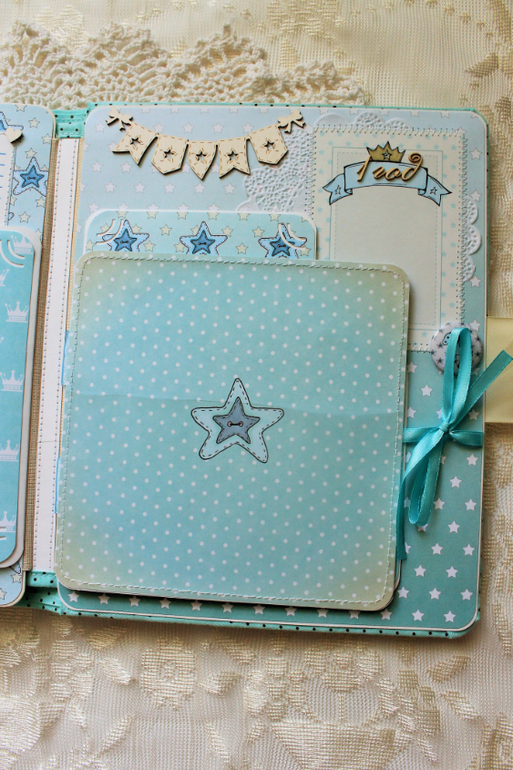 Альбомы ДетскиеАльбом формата 20*25см, выполнен из скрапбумаги коллекции "Звездный дракон"от Мона Дизайн в нежно-голубой гамме. Содержит 5 разворотов (10 страниц), вмещает в себя всего 68 фото, из них 58 фото 10*15см и 10 фото 9*10,5см. Также есть тканевый кармашек для бирочки из роддома, 4 прозрачных пластиковых кармана для дополнительных фото и конверт. 1 разворот посвящен беременности, рождению и 1 месяцу; 2 разворот: 2, 3 и 4 месяцы; 3 разворот: 5, 6 и 7 месяцы; 4 разворот: 8, 9 и 10 месяцы; 5 разворот: 11 месяцев и первый день рождения.