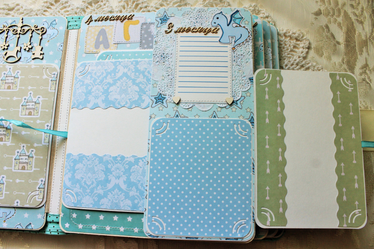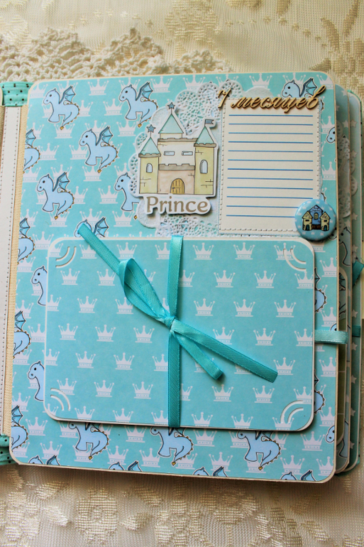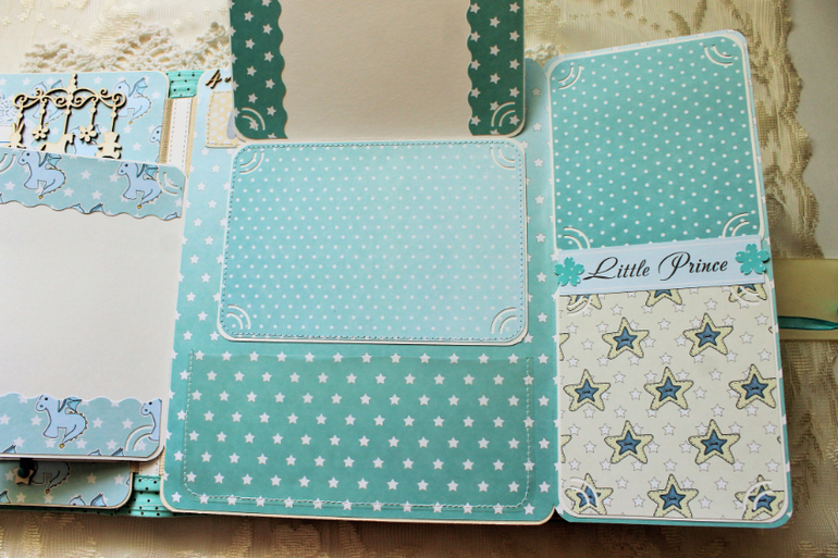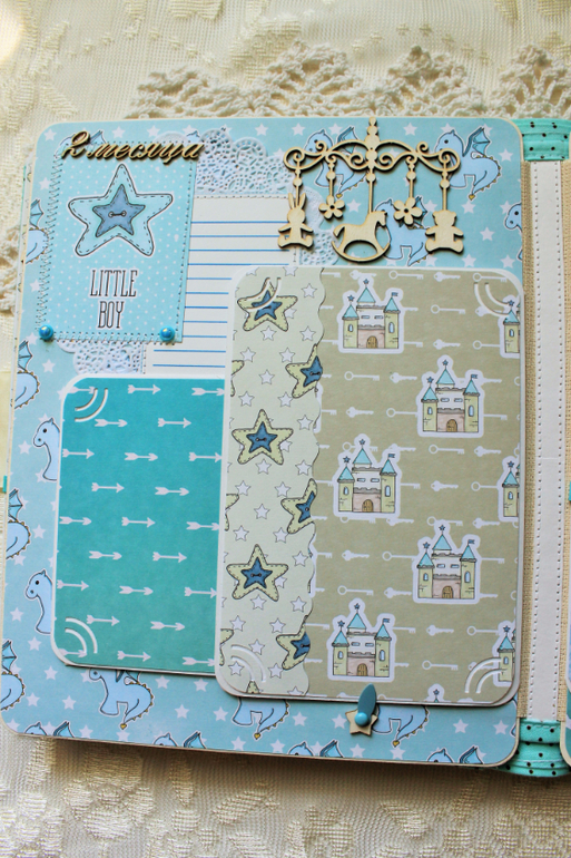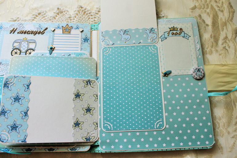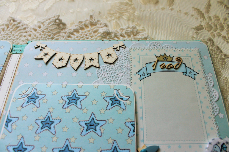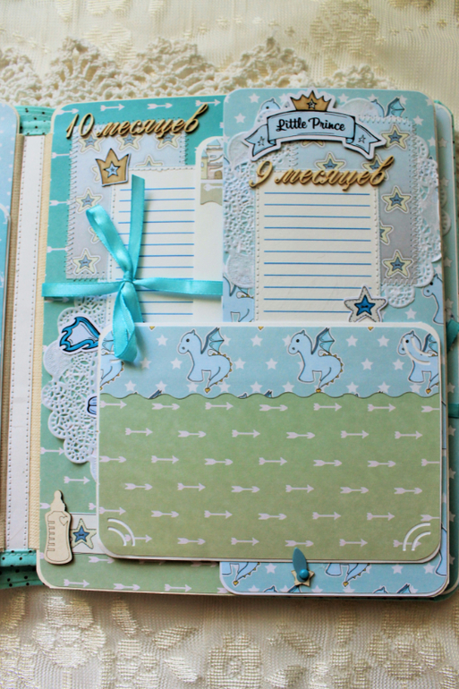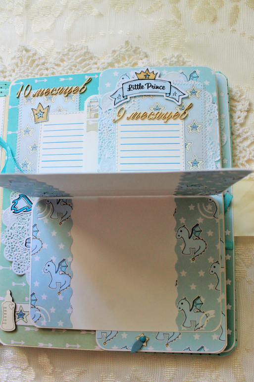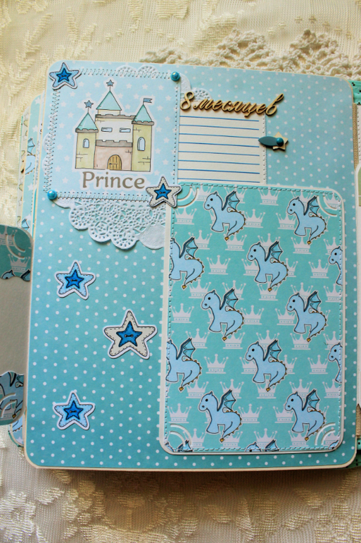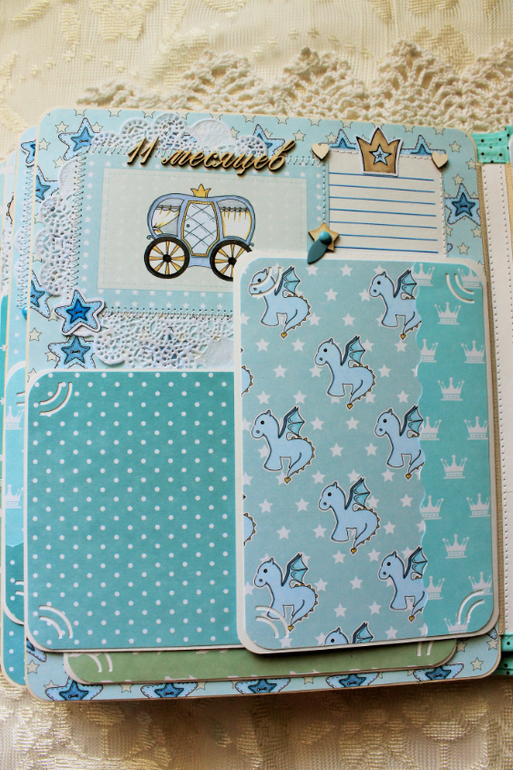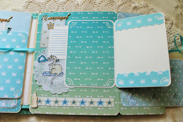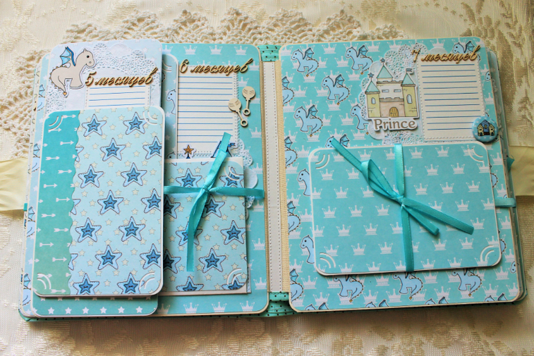 Альбомы ДетскиеАльбом формата 20*25см, выполнен из скрапбумаги коллекции "Звездный дракон"от Мона Дизайн в нежно-голубой гамме. Содержит 5 разворотов (10 страниц), вмещает в себя всего 68 фото, из них 58 фото 10*15см и 10 фото 9*10,5см. Также есть тканевый кармашек для бирочки из роддома, 4 прозрачных пластиковых кармана для дополнительных фото и конверт. 1 разворот посвящен беременности, рождению и 1 месяцу; 2 разворот: 2, 3 и 4 месяцы; 3 разворот: 5, 6 и 7 месяцы; 4 разворот: 8, 9 и 10 месяцы; 5 разворот: 11 месяцев и первый день рождения.