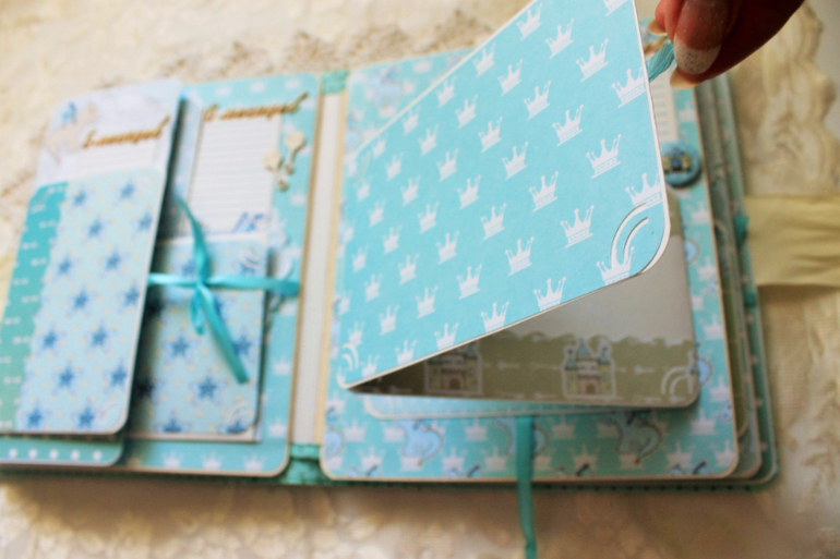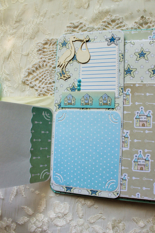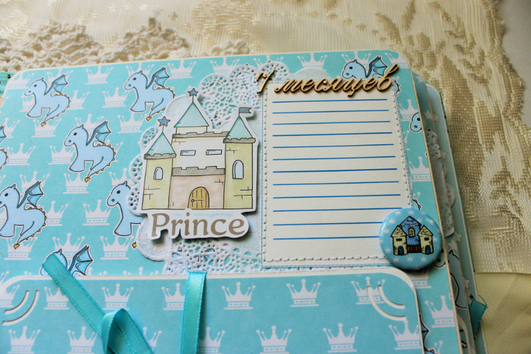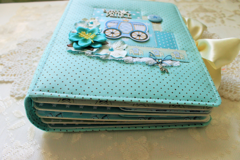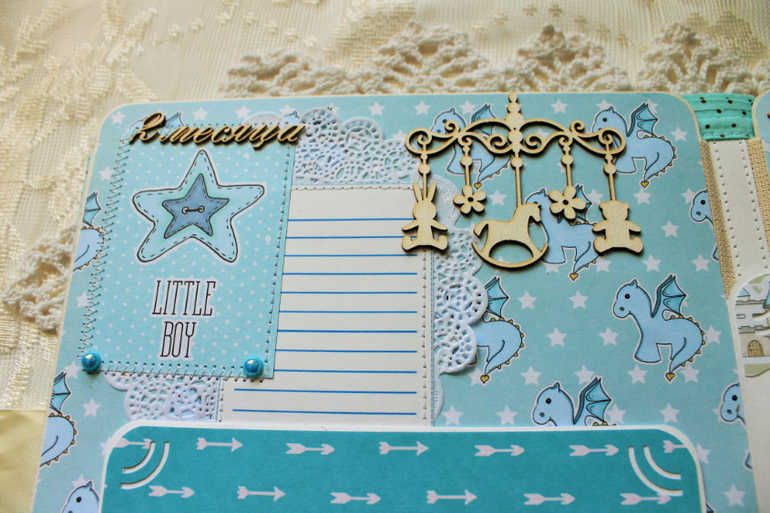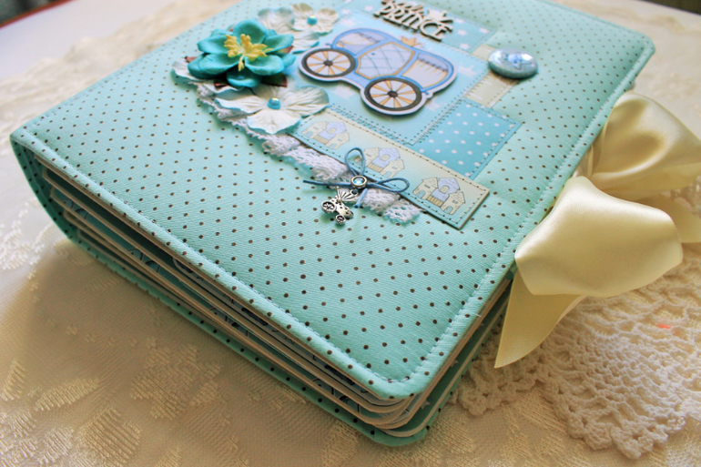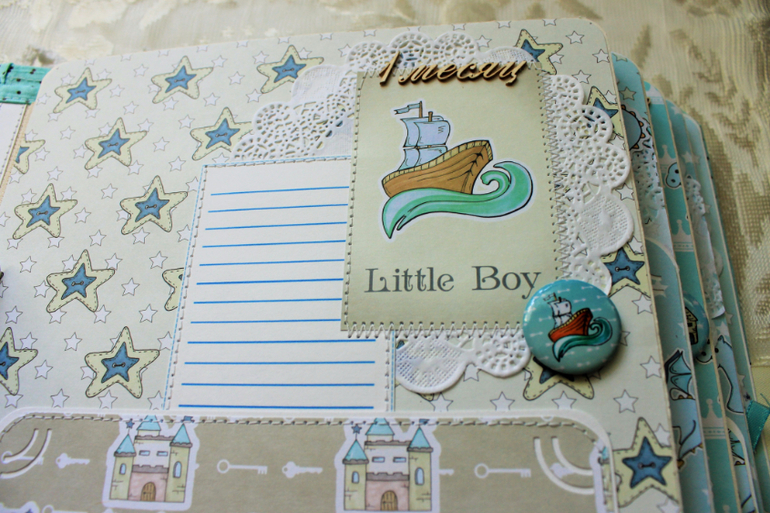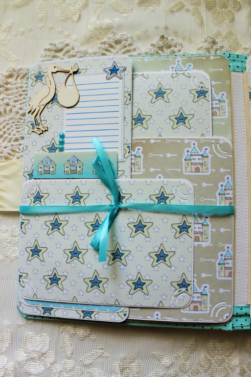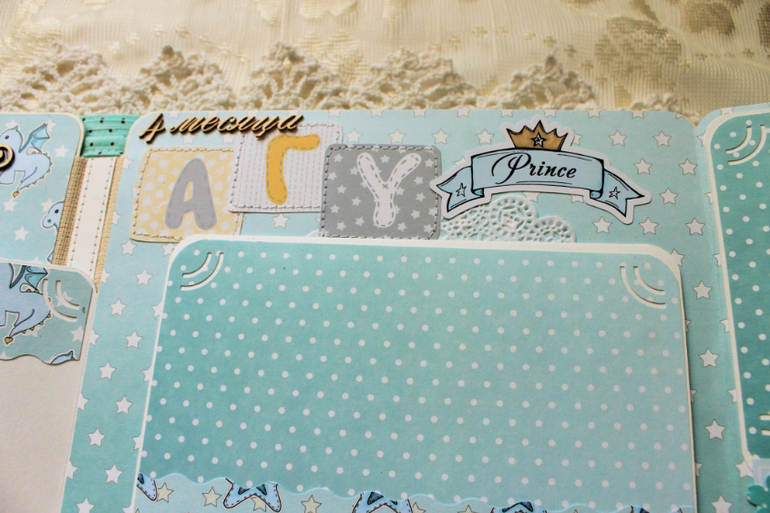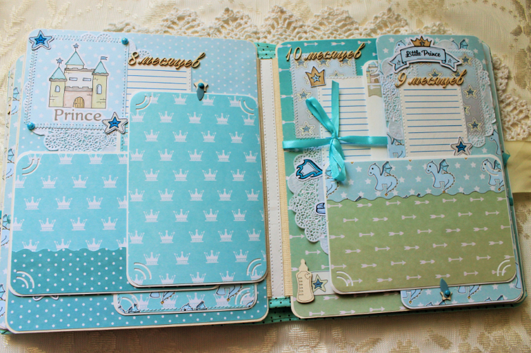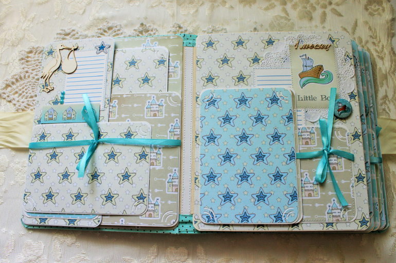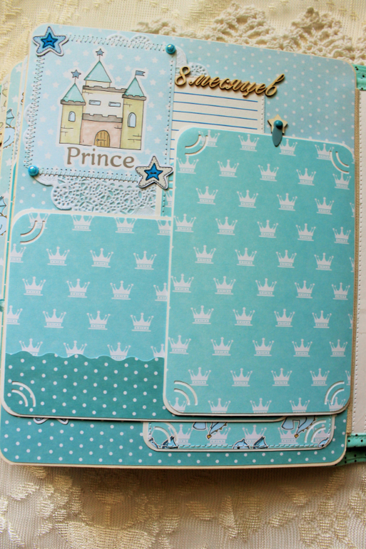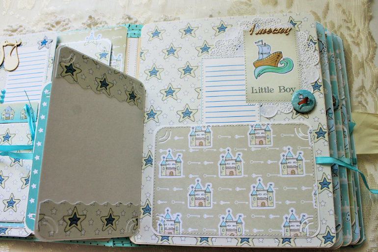 Альбомы ДетскиеАльбом формата 20*25см, выполнен из скрапбумаги коллекции "Звездный дракон"от Мона Дизайн в нежно-голубой гамме. Содержит 5 разворотов (10 страниц), вмещает в себя всего 68 фото, из них 58 фото 10*15см и 10 фото 9*10,5см. Также есть тканевый кармашек для бирочки из роддома, 4 прозрачных пластиковых кармана для дополнительных фото и конверт. 1 разворот посвящен беременности, рождению и 1 месяцу; 2 разворот: 2, 3 и 4 месяцы; 3 разворот: 5, 6 и 7 месяцы; 4 разворот: 8, 9 и 10 месяцы; 5 разворот: 11 месяцев и первый день рождения.