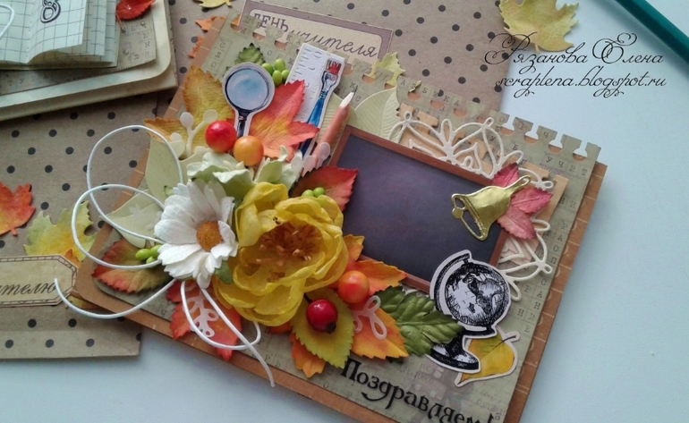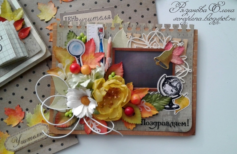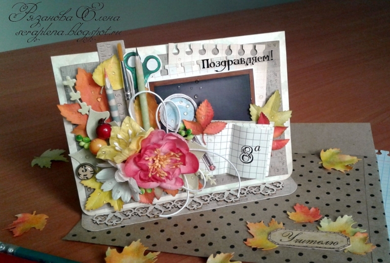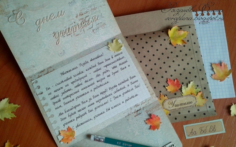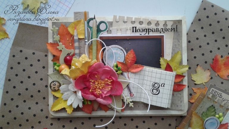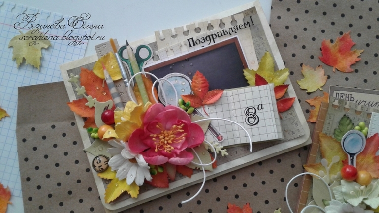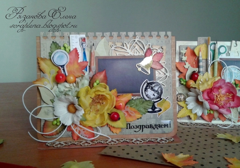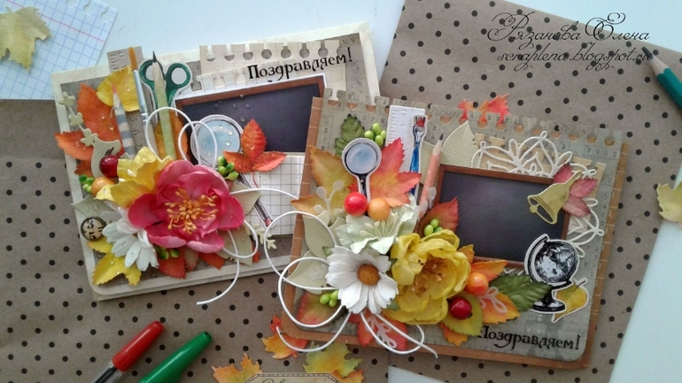Первая открыточка с текстом, вторая без. Листья красила сама, карандашик и тетрадочка тоже рукодельные. Бумага Скрапберрис и какая-то еще, вырубка Мона, ножи АгиАрт, чип Рукоделушки.