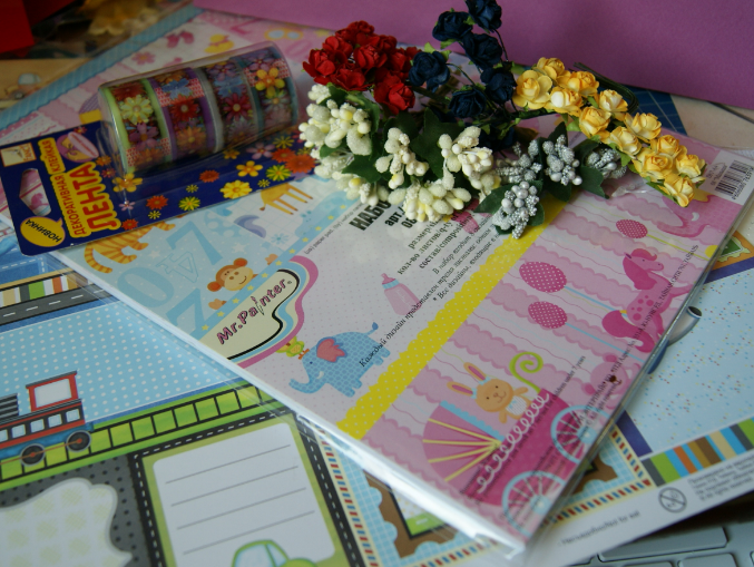 4) набор бумаги А4, лист 30х30 с тегами, цветы и цветной скотч