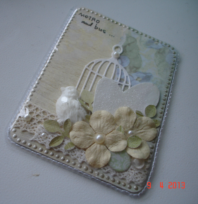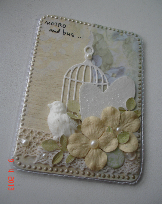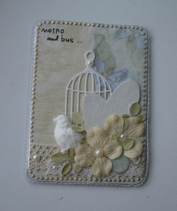 Не поверите, обложка для проездного! На самом деле, идею мне подкинули коллеги, когда я купила себе стандартную обложку, они возмутились, мол у ЭЛены не может быть обычная обложка. Вобщем вот, сделала, опять с птичкой и клеткой. Сверху пластиковый чехол, прошитый на машинке.