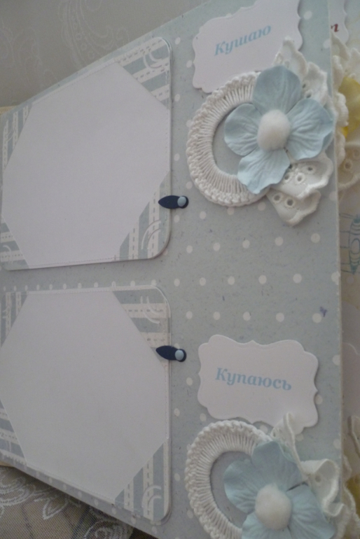 В целом альбом отличный, но я бы посоветовала ткань для обложки использовать более плотную. Рисунка в виде звезд практически не видно, сразу удешевляет работу. Рюши по краю обложки смотрятся вообще класс, мне понравилось (возьму себе на заметку). Ну и декор внутри альбома.....!!! Почему он везде одинаковый, меняется только цвет цветочков ???? Девочки не ленитесь - пробуйте экспериментировать !!!! Скрапбукинг - это творчество, включайте фантазию. Ирина, я надеюсь другие два альбома не точная копия этого! Желаю приятного творчества.