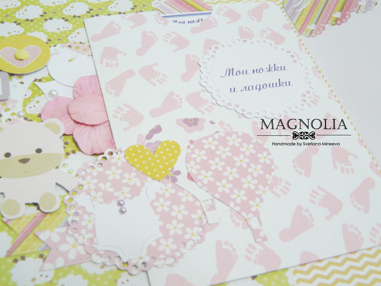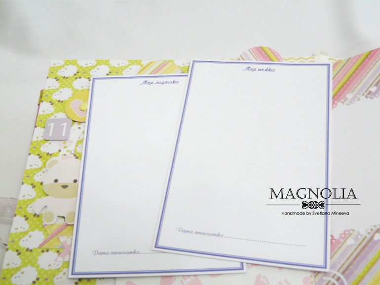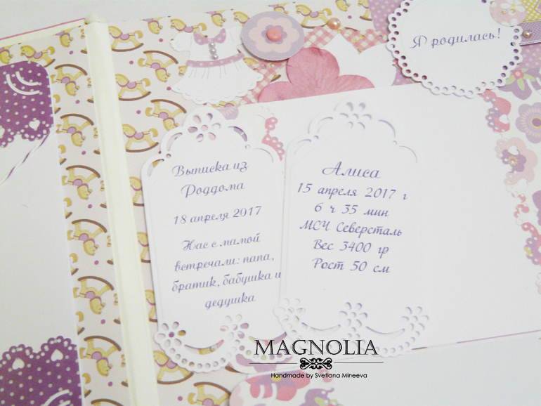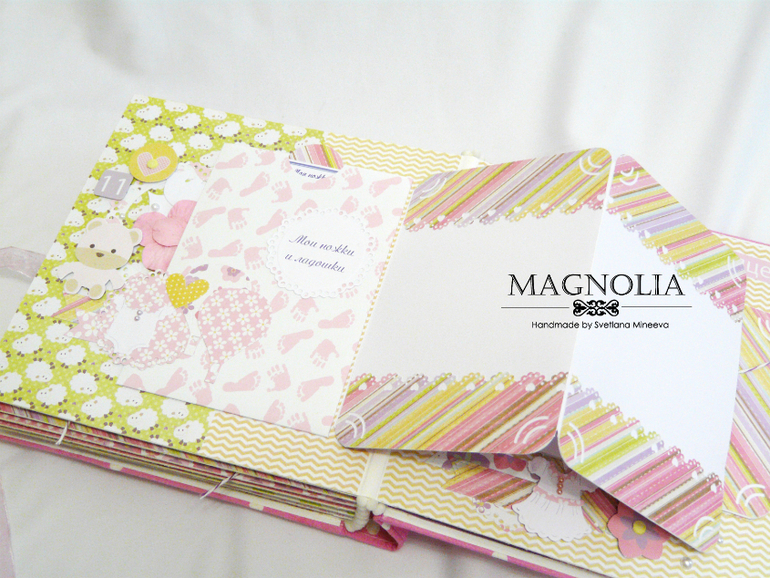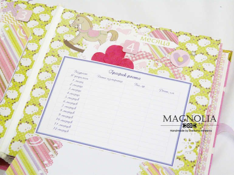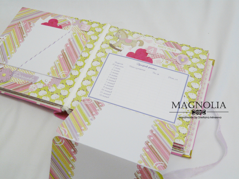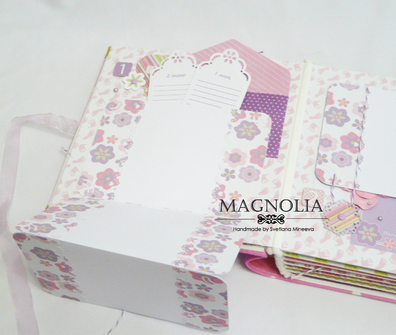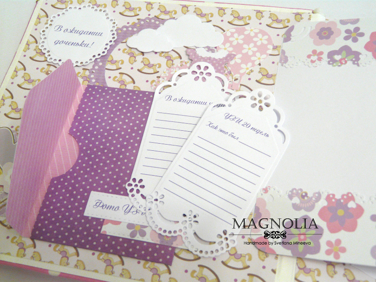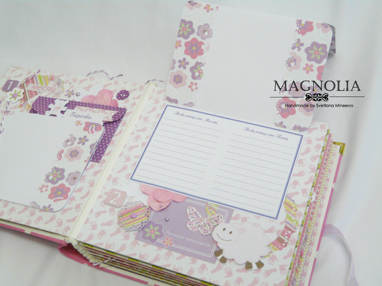В альбоме предусмотрены карманы для фото узи, бирочки, локона. Множество тегов для записи (беременности, данные пр рождении, по месяцам, с нового года и дня рождения). Так же есть поля для записи первых пожеланий мамы и папы, графика роста, роста зубок, карточки для обводки ножки и ладошки, достижений первого год