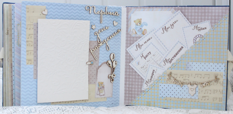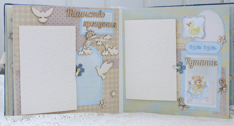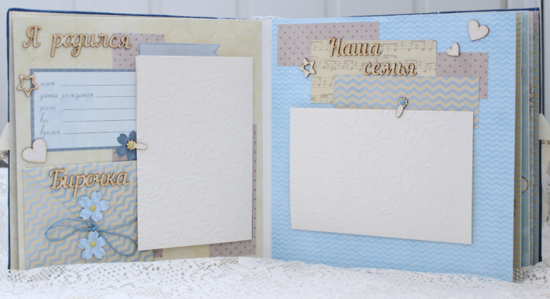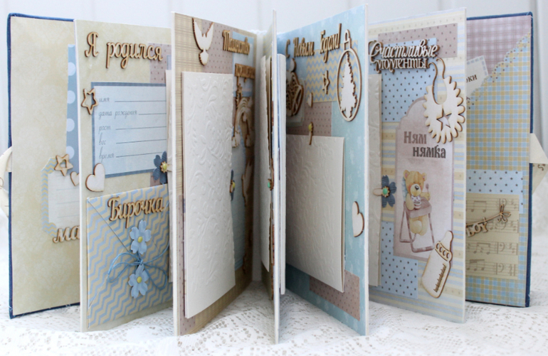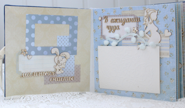 Альбом выполнен по темам: "Маленькое счастье (фото УЗИ", "В ожидании чуда", "Я родился + конвертик для бирочки", "Наша семья", "Таинство крещения", "Купание", "Сладкие сны", "С Новым Годом!", "Любимый карапуз", "Счастливые моменты", "Первый День Рождения", "Таблицы роста и достижений ребенка".
