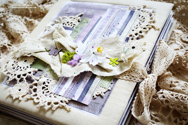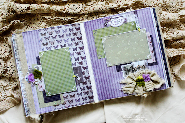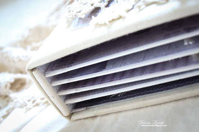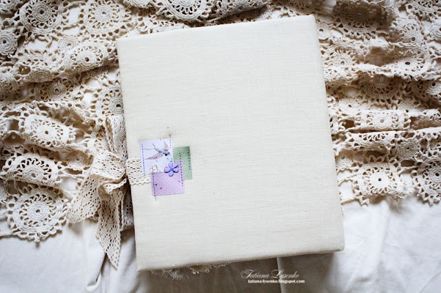 В альбоме 5 разворотов и твердый переплет С.Ковтун. Обтянут альбом натуральным льном и завязывается на натуральное кружево