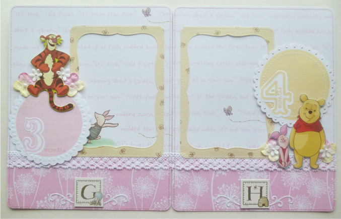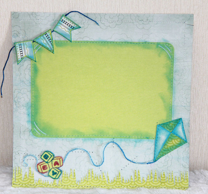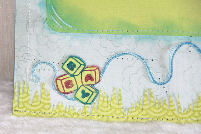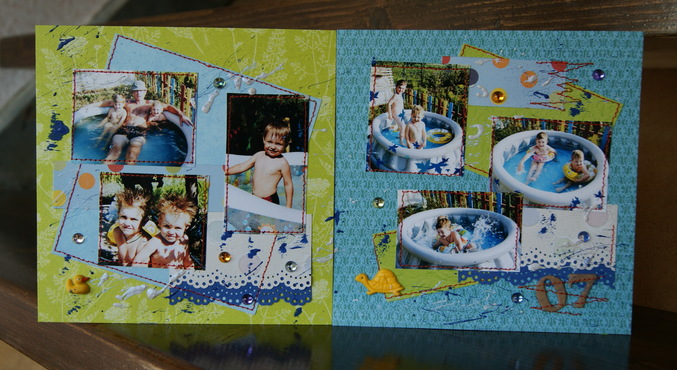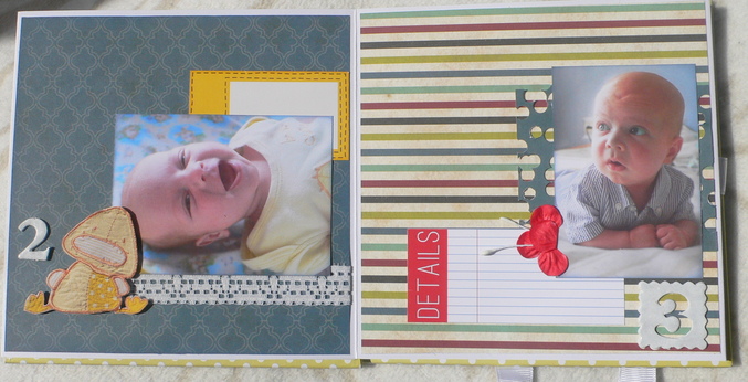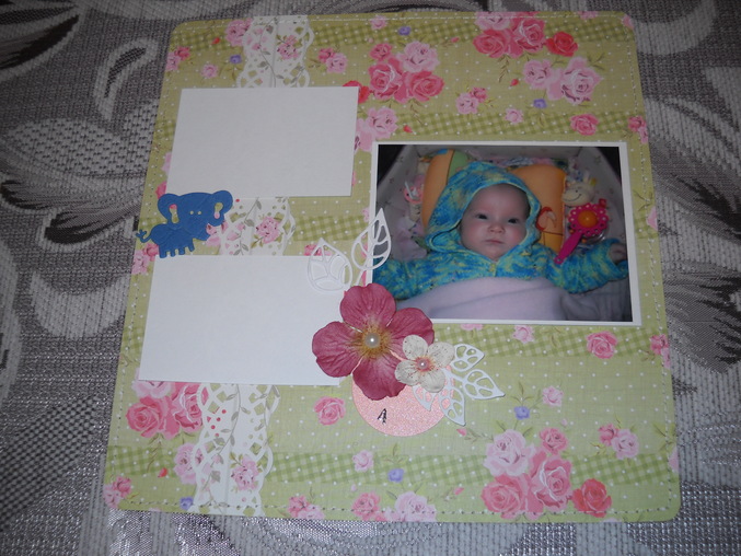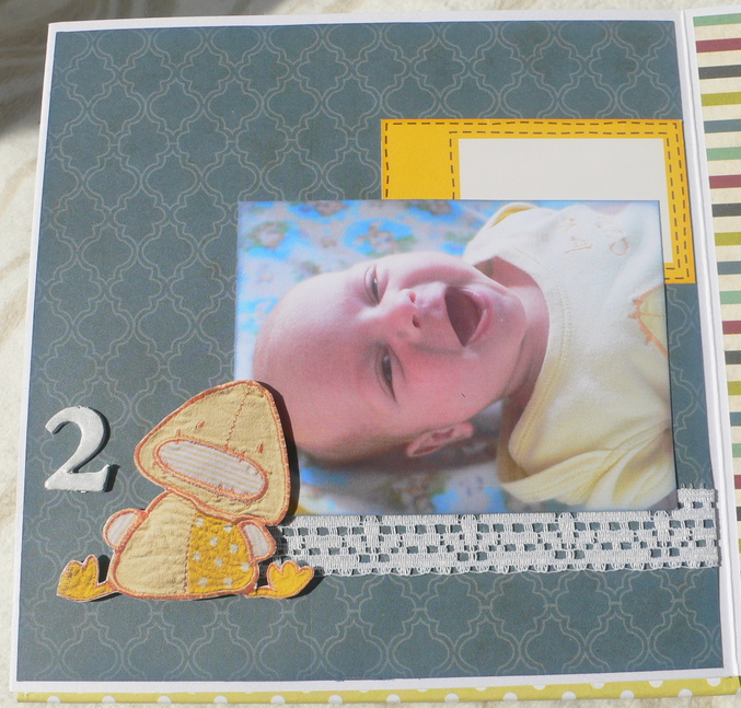первая страничка. тут у нас в наличии животное. это утенок с бодика, на фото его немного видно. бодик у нас в ходу, да и большой утенок, поэтому я его сфоткала, обработала в фотошопе, напечатала и приклеила на подушечки