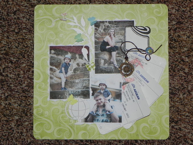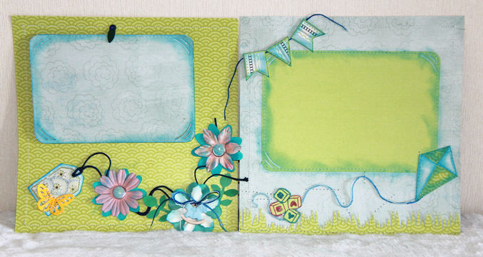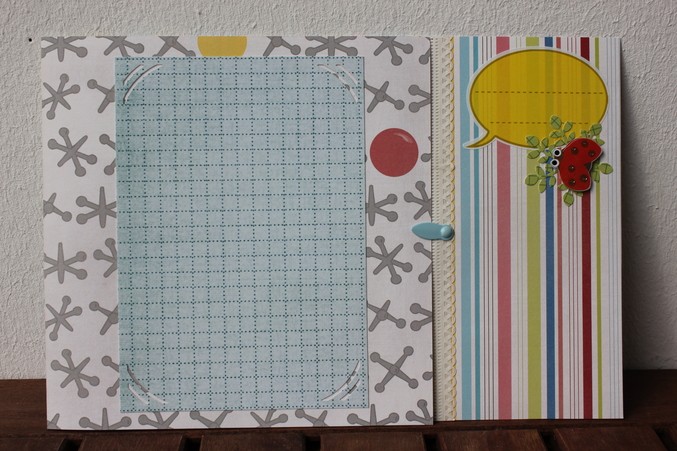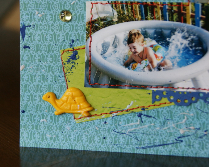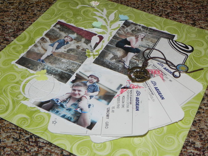 вторая страничка. тут у нас второй элемент — дырокольности. так как дырокола у меня нет (вру. есть. для скругления уголков и для фото), то обходились подручными средствами — обычным дыроколом (Света, я там видела бонусы-плюшки для тех, кто справился с заданием без дыроколов. можно я пропущу элемент не в пятом развороте, а в третьем, это мое насекомое, будь оно не ладно?)