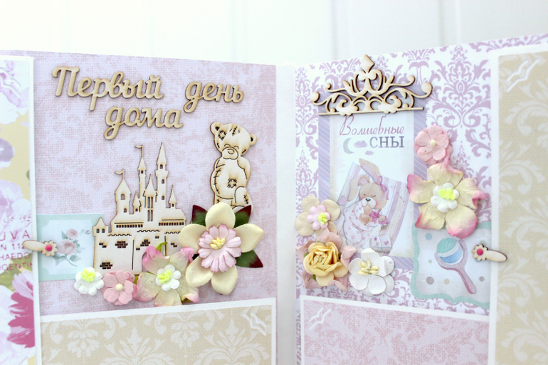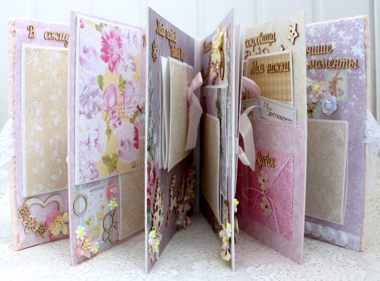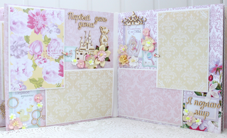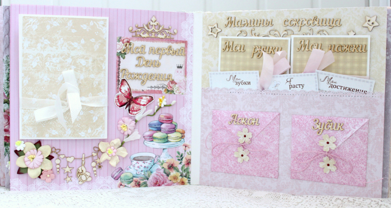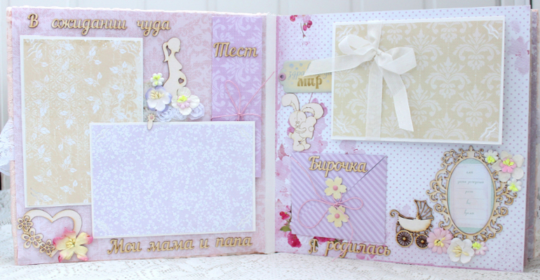 Альбомы ДетскиеВсем привет) Хочу показать вам большой альбом для девочки. Формат альбома 25х25, на 10 декорированных страниц, на 70 фотографий. Альбом выполнен по темам: "Мои мама и папа", "В ожидании чуда (+кармашек для теста)", "Я родилась (+конверт для бирочки)", "Первый день дома", "Первое купание", "Волшебные сны", "Я познаю мир", "Мой первый Новый Год", "Папина дочка", "Прогулки", "Мой первый День рождения", "Мамины сокровища (конверты для локона и зубика)", "Открытки для отпечатков ручек и ножек", "Таблицы роста, зубиков и достижений ребенка", "Счастливая семья", " Лучшие моменты"