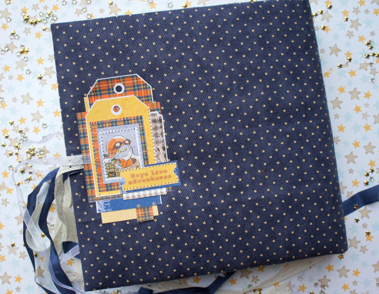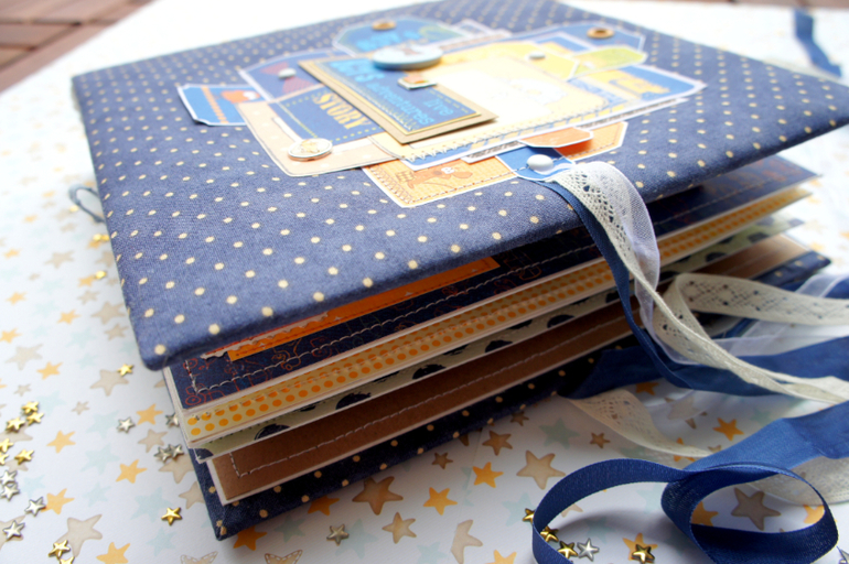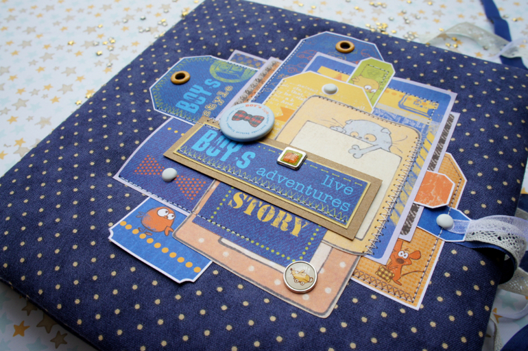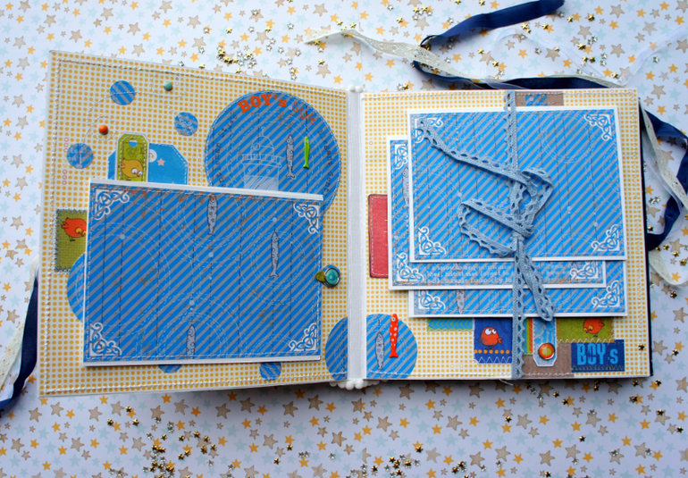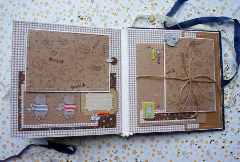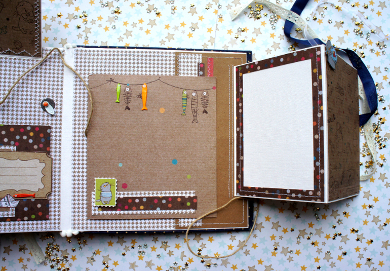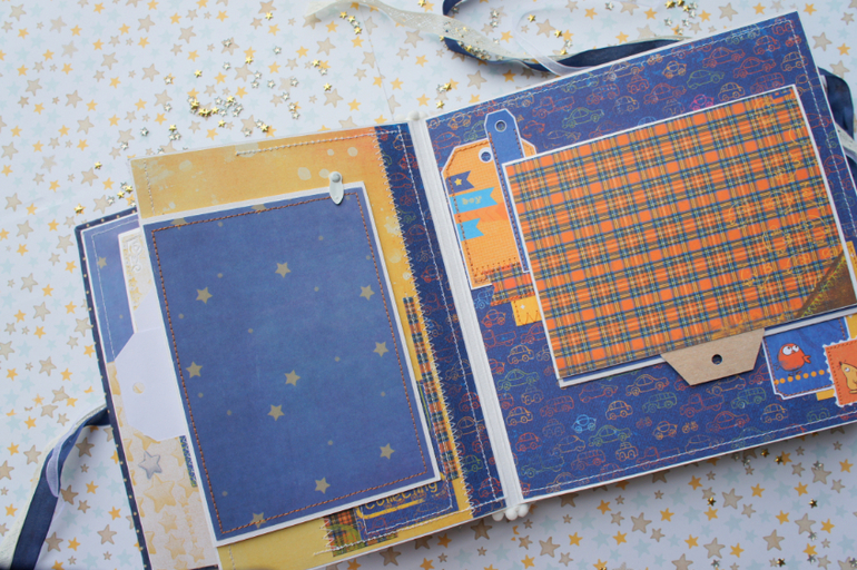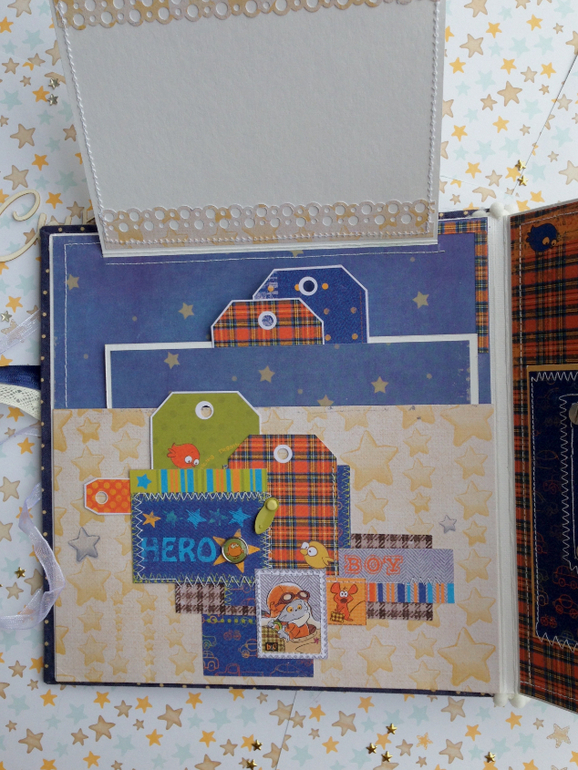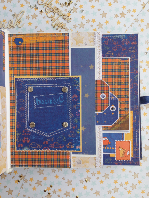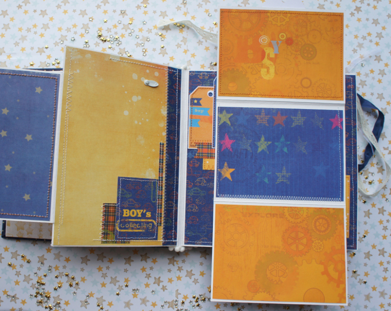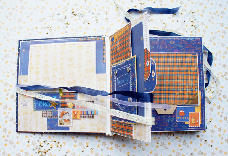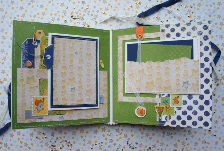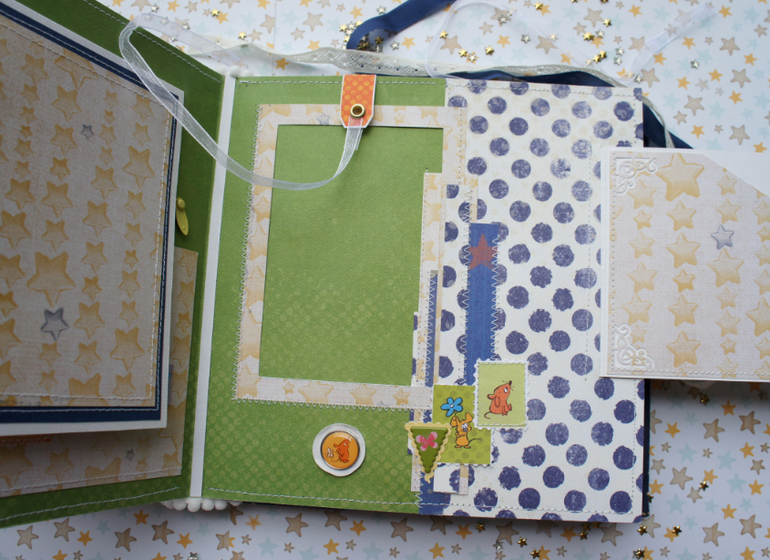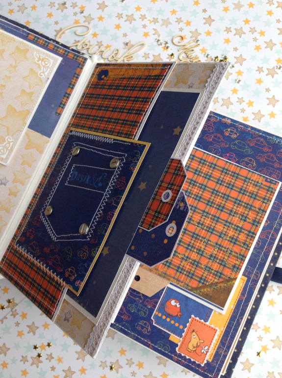 В альбоме пять разворотов со множеством раскладушек и кармашков с тегами и карточками для фотографий и записей.