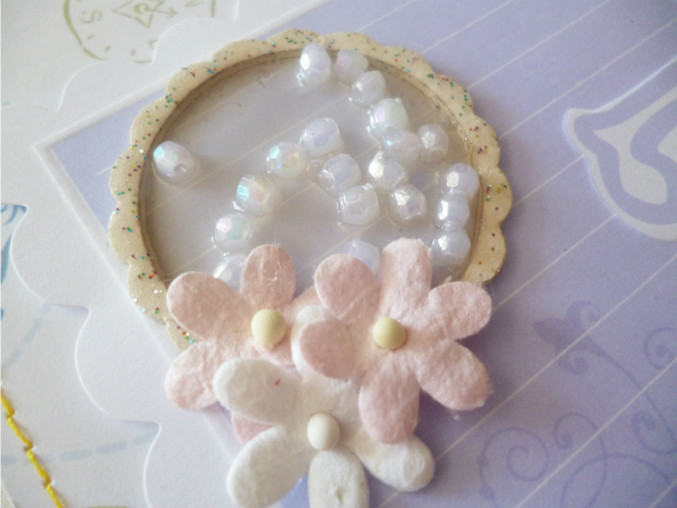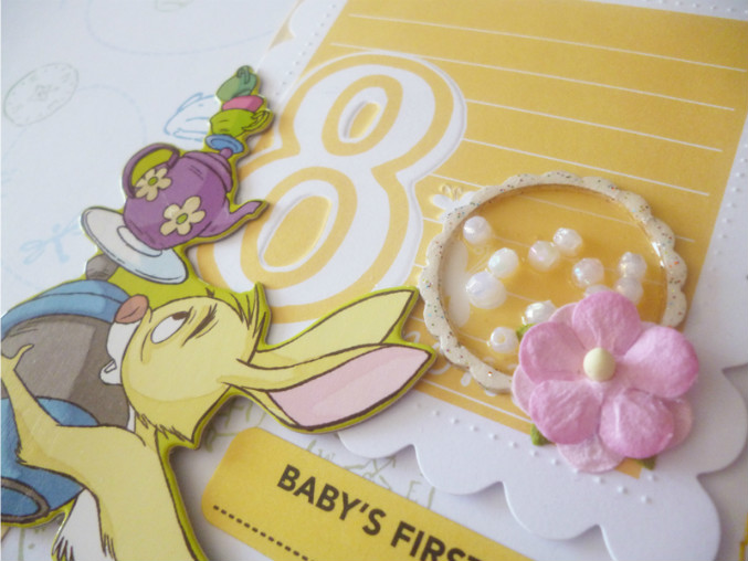 Я все три задания объединила в одном элементе. Круглую декоративную рамочку из чипборда покрасила, заэмбоссила пудрой с Блестками, приклеила на карточку для журналлинга, пространство внутри залила глосси, создав прозрачность, и посыпала мелких перламутровых Бусинок, тоже, кстати, прозрачных )) Ну еще у меня, как и на остальных разворотах, Бумажные рамочки-кармашки для фото и Буквы, и еще Бумажный Бордюрчик с надписью Baby Girl. У Ослика на хвосте - Бантик, у Кролика в руках - Блюдце, а кое-где заметны Бабочки ))