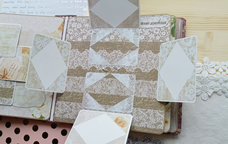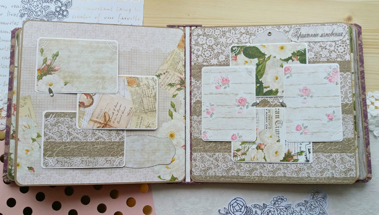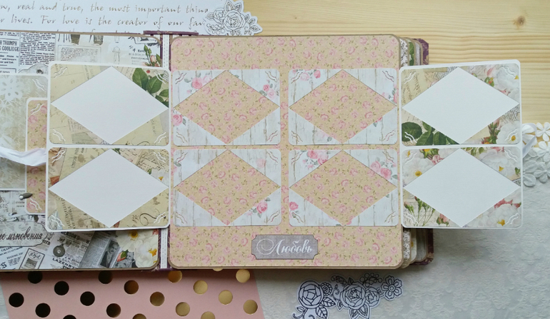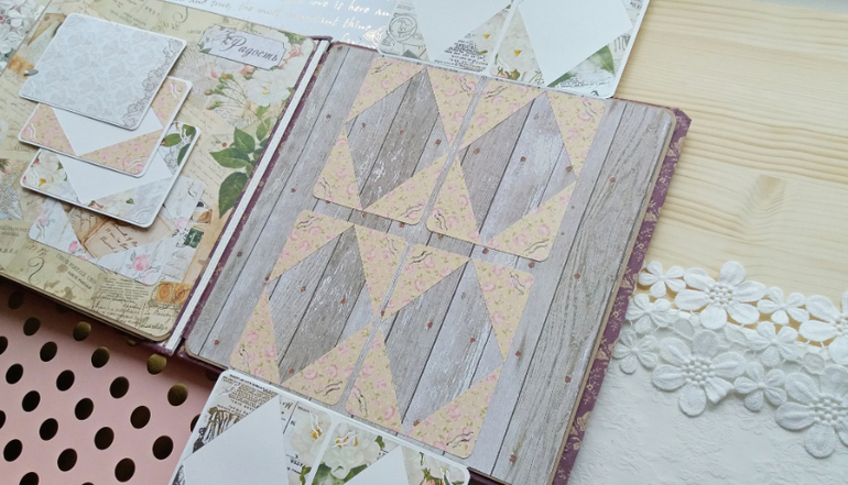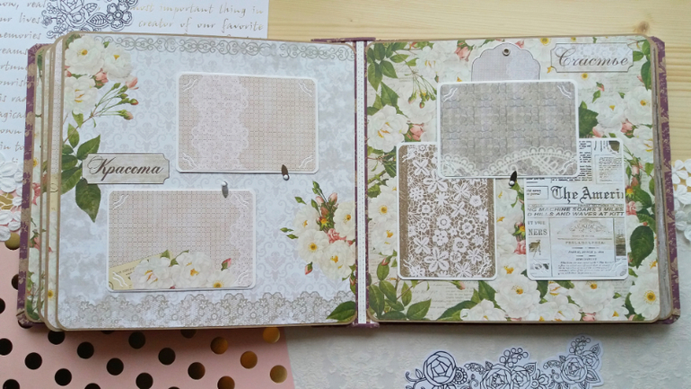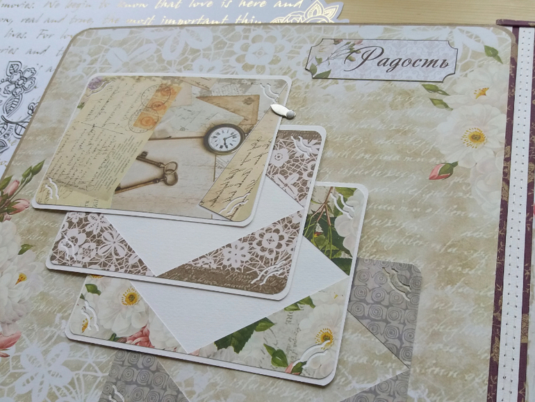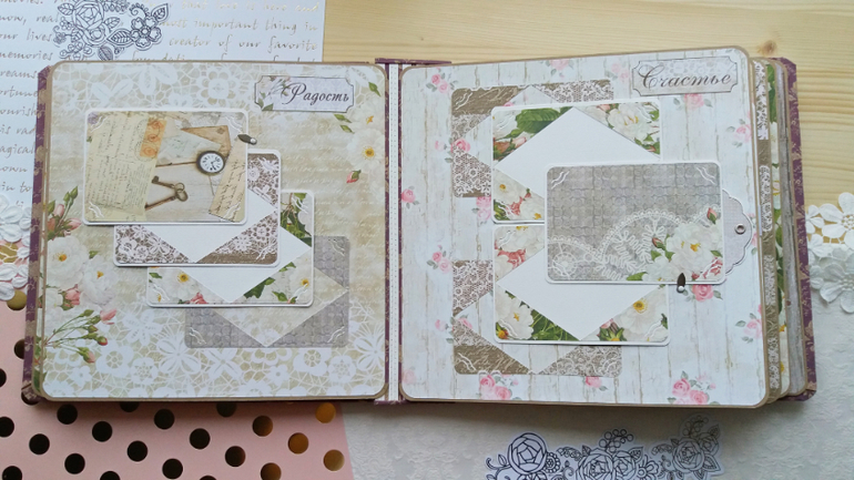 Кстати, вмещает он в себя 99 фото! Сто не получилось)) Двадцать подложек для фото, а для остальных же нарезала, надыроколила и закруглила 316 уголков! Честно, думала, что дырокол угла не выдержит)) Третий разворот: