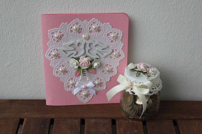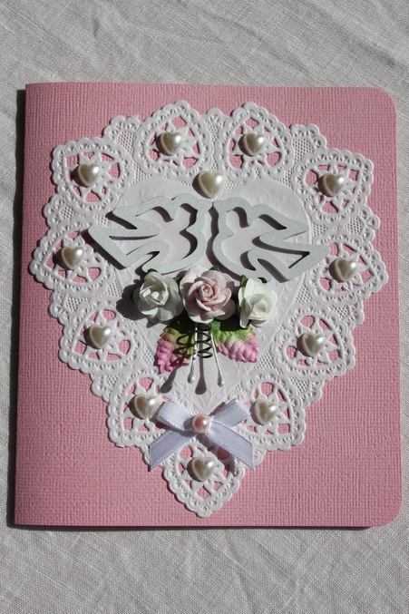 А это открыточка. Тоже все просто и лаконично. Использовала кардсток, бумажную салфетку, атласный бантик, цветочки, листики, тычинки, полубусины, деревянные голуби.