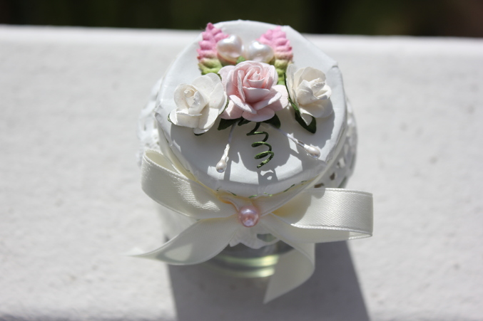 Эта баночка для денег. Использовала бумажную салфетку, атласную ленту, цветочки, листики, тычинки, полубусины.