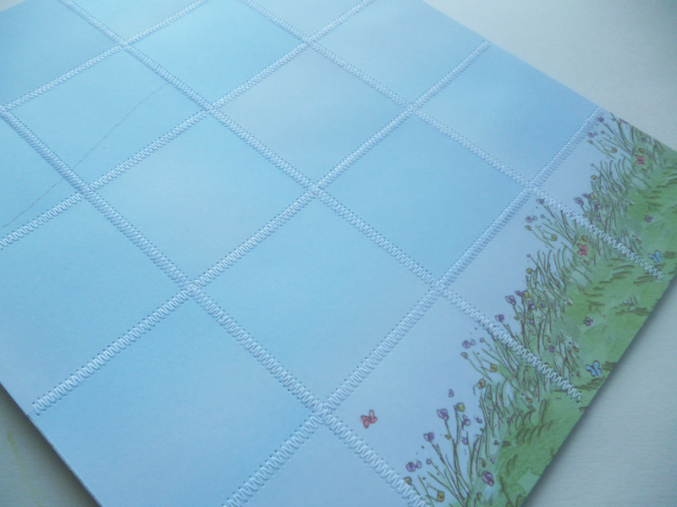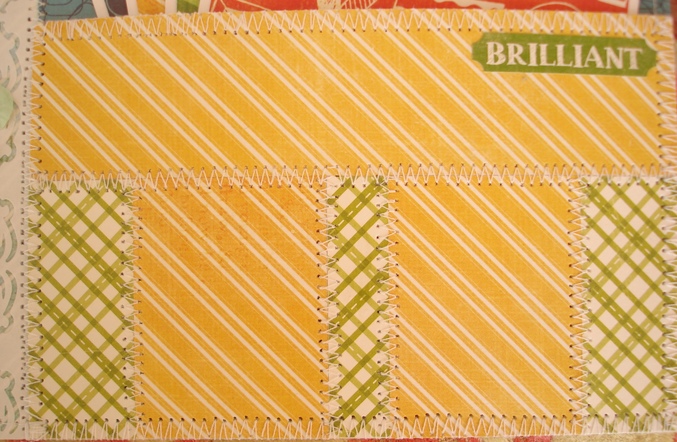Когда все наклеено, с помощью ножа и линейки ровняем края нашей детали. И можно приступать к обработке стыков. Если у вас есть машинка - вот тут и пригодится нам зиг-заг, отработанный в шестом развороте. Если нет, то делаем имитацию зиг-зага или обычной машинной строчки по краям лоскуточков с помощью штриховых линий. Вернемся к машинному зиг-загу. Я для себя в процессе шитья "Тёпленького альбомчика" выработала несколько правил. Делюсь ))
