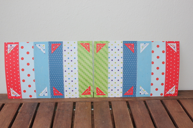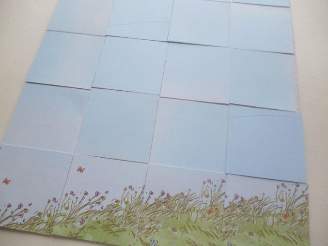 Можно нарезать лоскутков из одного вида бумаги, они тоже будут хорошо смотреться. Мне нужна была небесно- голубая страничка, но цельного листа не осталось, накроила квадратиков из остатков...