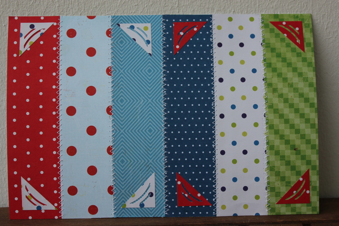 Нарезаю квадратики из остатков бумажки. Вы можете взять за основу любую схему: различные сочетания квадратов, прямоугольников, полосочек, треугольников и т.п. (Загляните за вдохновением в сообщество к настоящим швейным "пэчворкистам" ))) или посмотрите другие схемки в моем пэчворк-альбоме с собачкой - вот тут). Кройка бумажных лоскутков, пожалуй, самый ответственный этап в этом деле. От того, насколько ровно и аккуратно вырезаны элементы, зависит весь вид будущей работы.