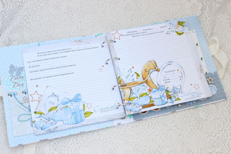 Альбомы ДетскиеАльбом - дневник для мальчика от рождения до 7 лет на кольцевом механизме в мягкой тканевой декорированной обложке. Внутри 30 плотных листов (60 страниц) для записей и фотографий.