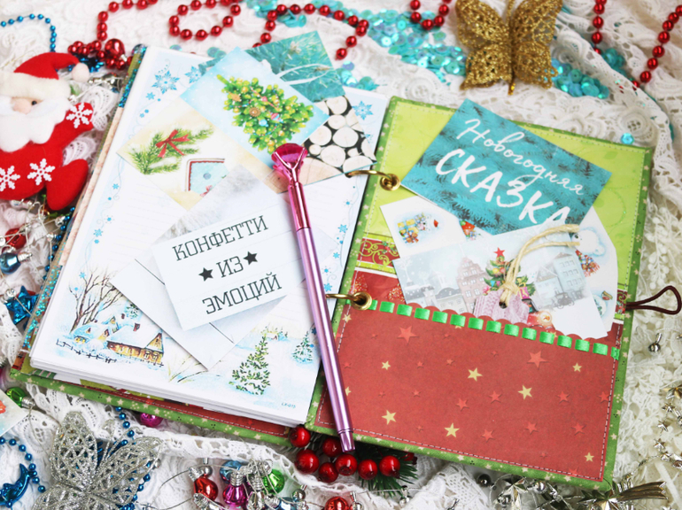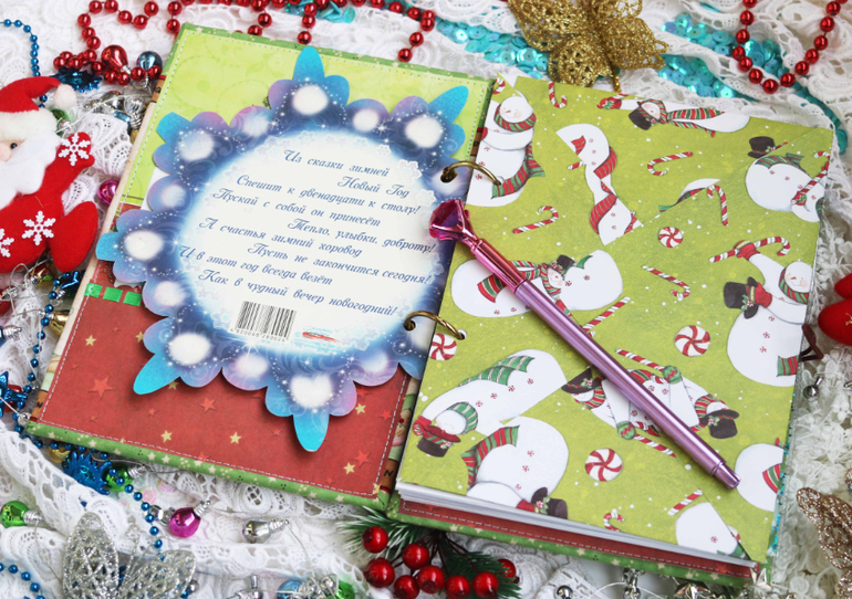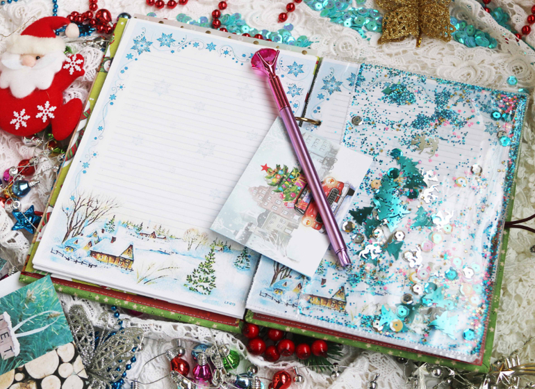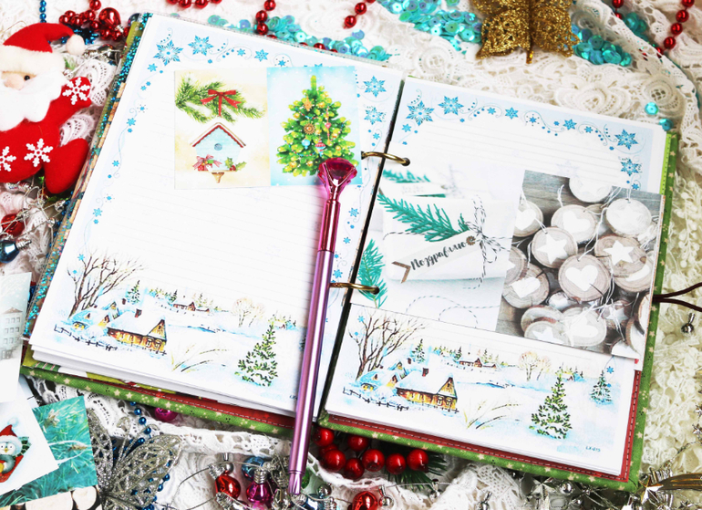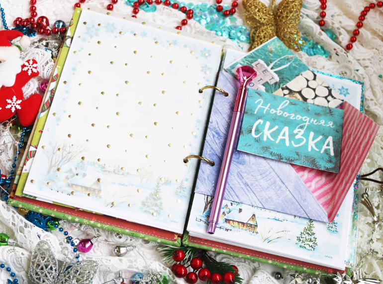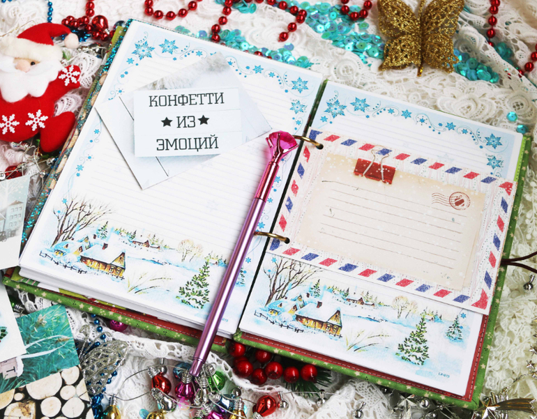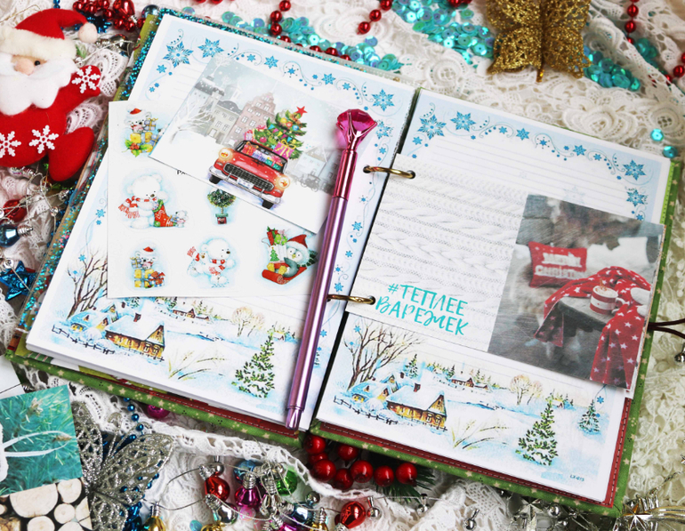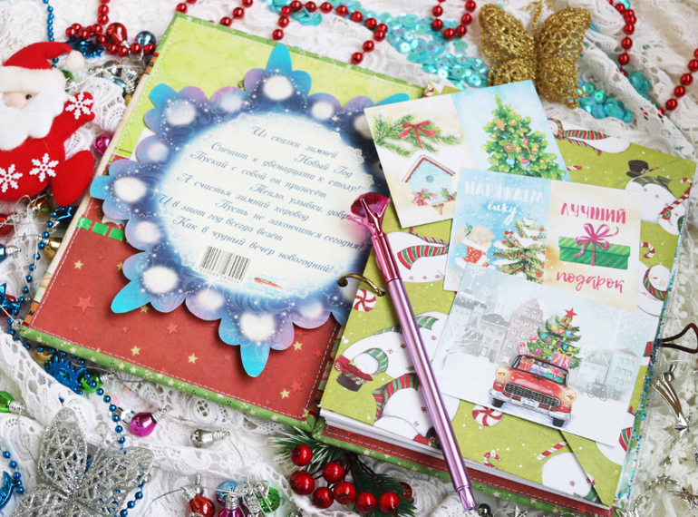 В него входит: красивая ручка, открытки новогодние, карточки. конверты. наклейки, калька с золотым рисунком, кармашки для важных бумажек, теги, шейкер-антистресс, разделители и много всего интересного)) Дальше много фото: