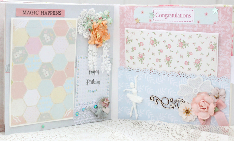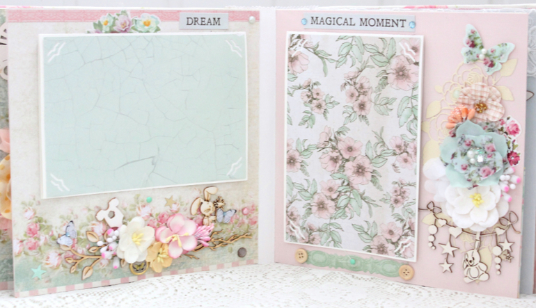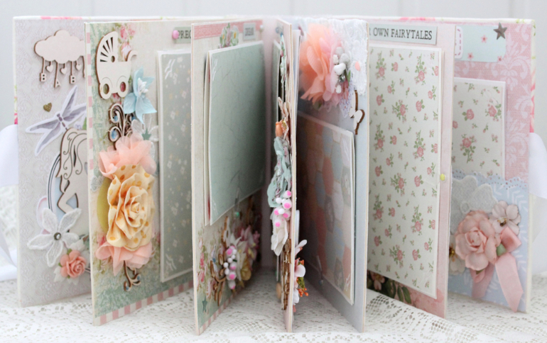 Объемный альбом ручной работы для девочки с множеством объемных цветов и различных украшений на каждой странице. Формат альбома 20х20, внутри 12 декорированных страниц, толщина 9 см, рассчитан на 60 фотографий.