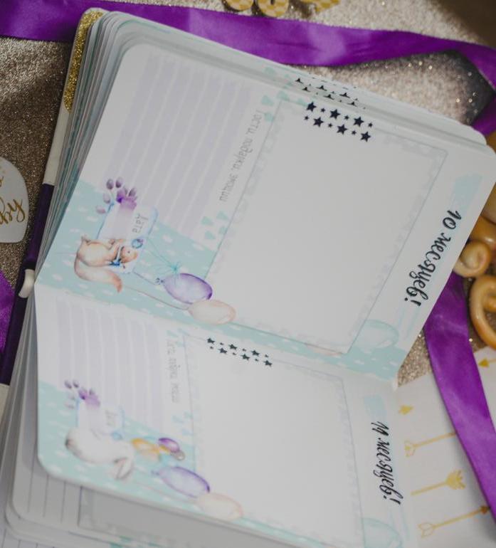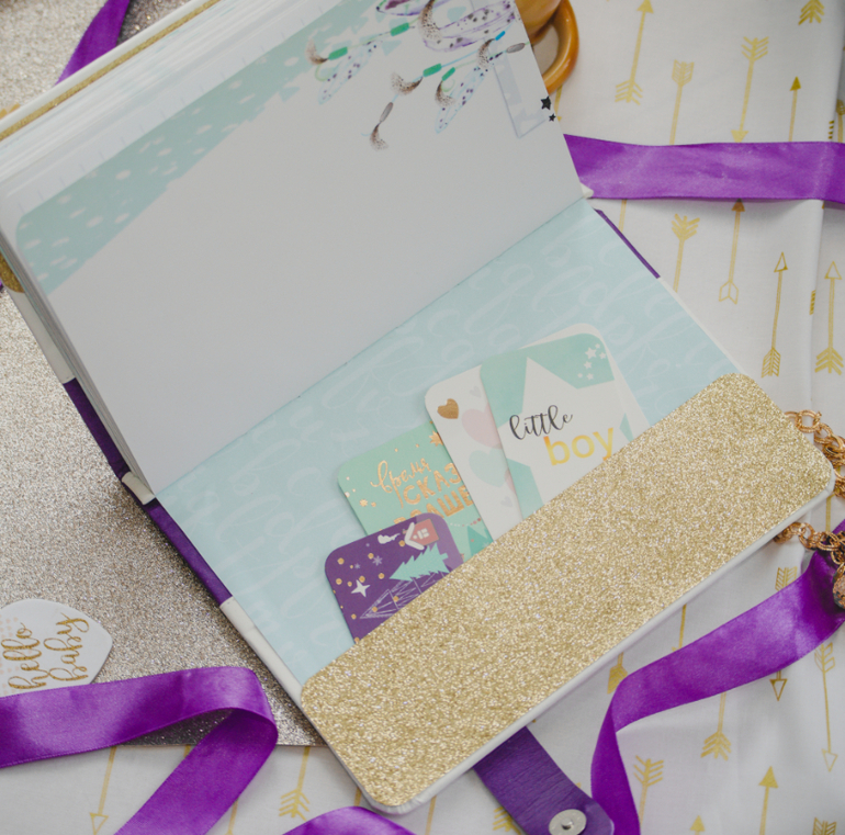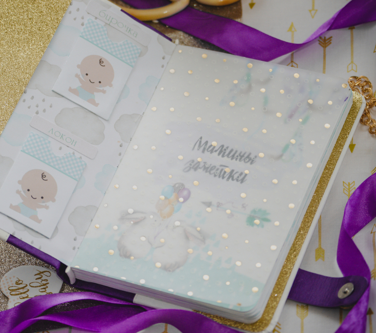 Приятные мелочи в виде карточек и небольших конвертиков для бирочки и локона украшают форзацы.