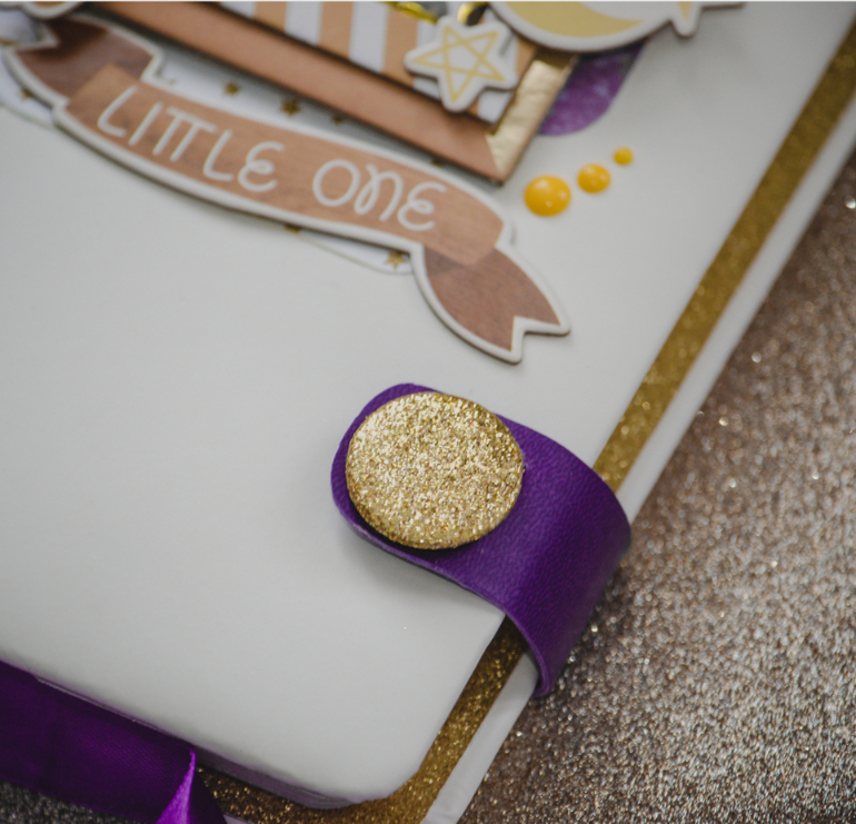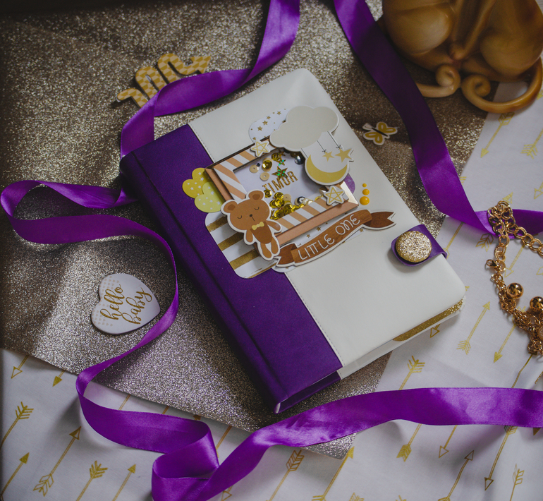 Выполнен из экокожи двух цветов. Обложку украшает рамочка шейкер с именем. Добавила золотой акцент на магнитный хлястик и кармашки внутри альбома. И вот оно очень удачное и гармоничное сочетание..) Внутри 120 плотных дизайнерских страничек. Добавлено 2 листа скрапбумаги, калька с золотым фольгированием. Все это дополнительно разбавляет странички альбома.