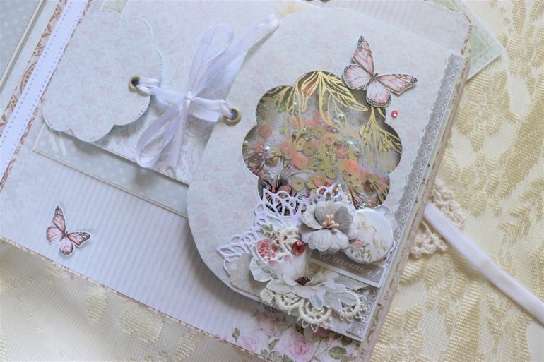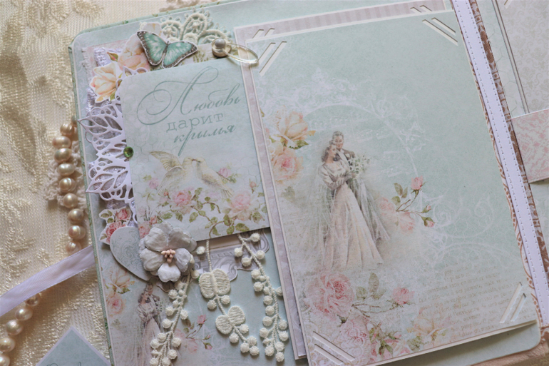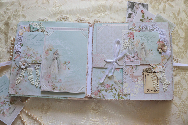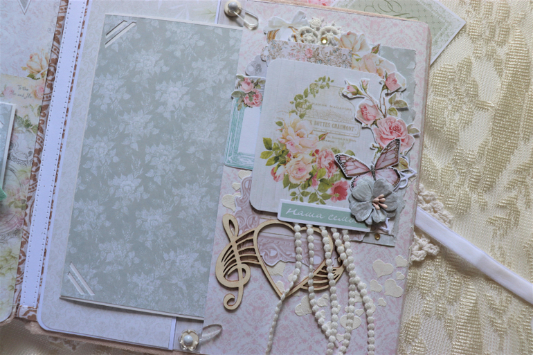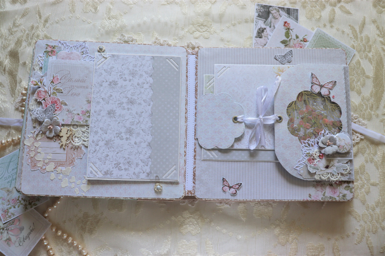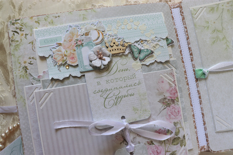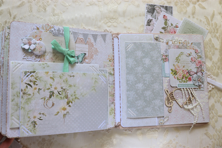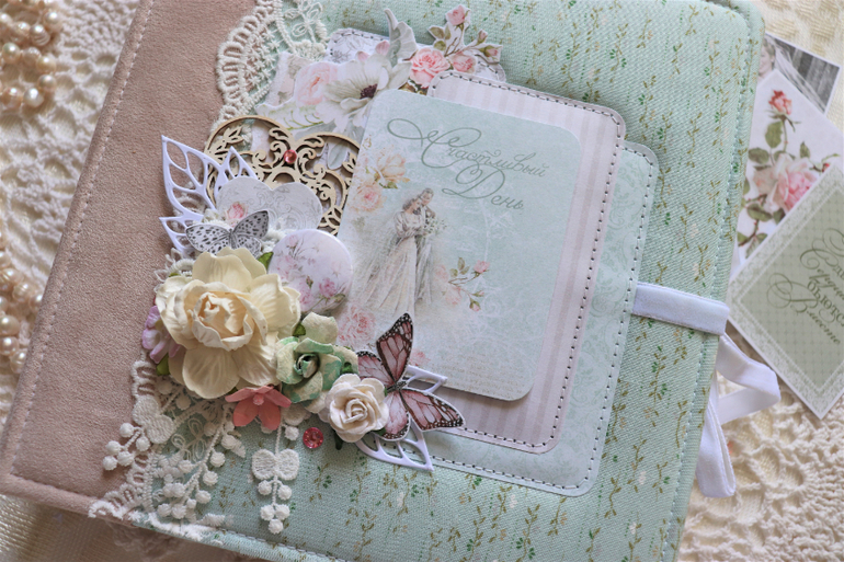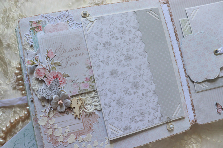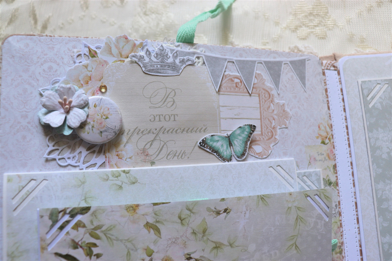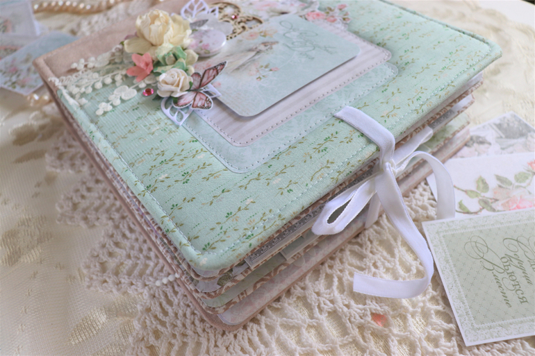 Торцы страниц обтянуты хлопком для большей прочности, странички украшены многослойными и чуть объемными композициями