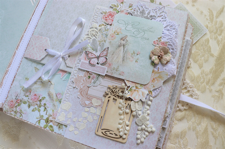 Обложка обтянута нежной замшей и американским хлопком премиум качества, украшена свадебных кружевом, цветами, вырубными элементами, камушками