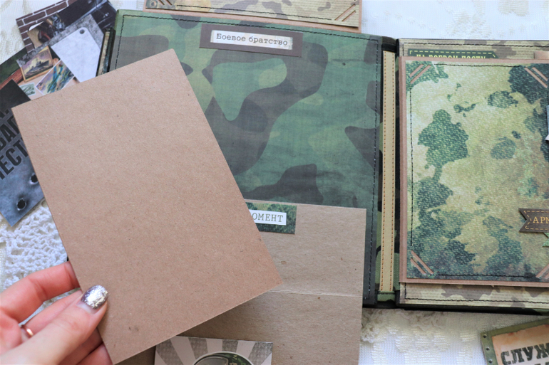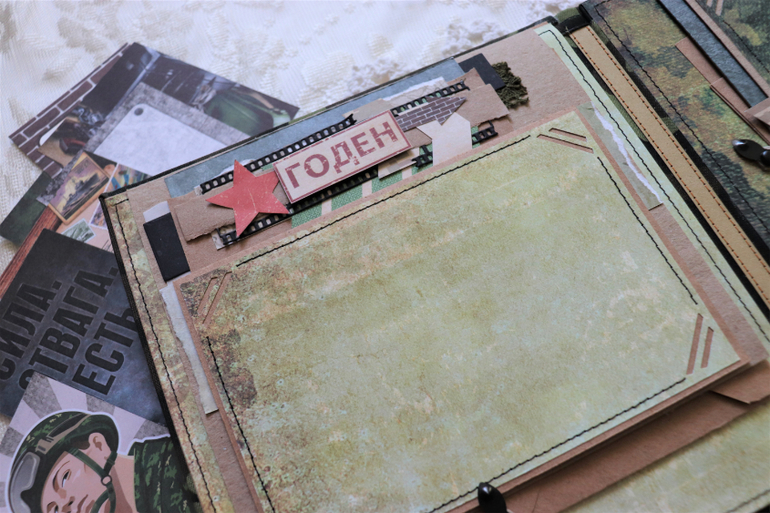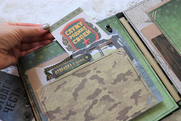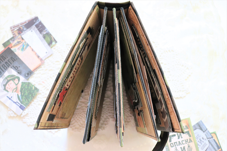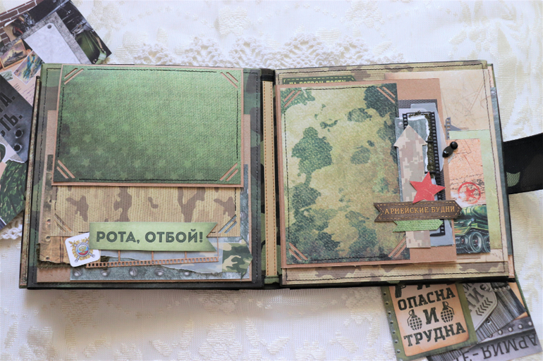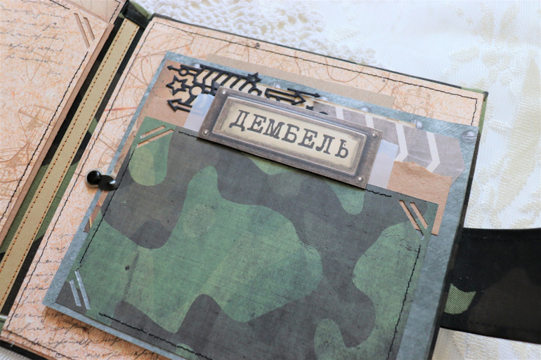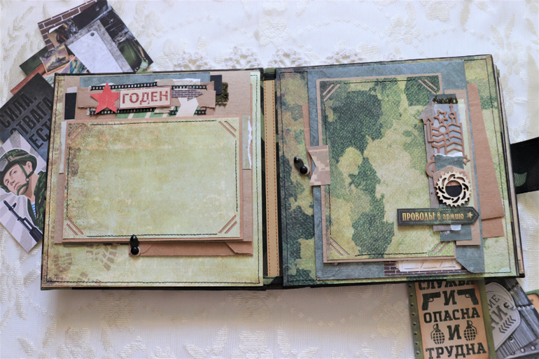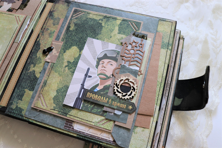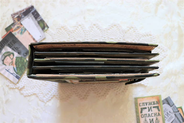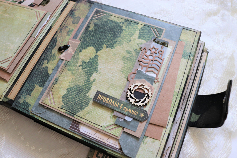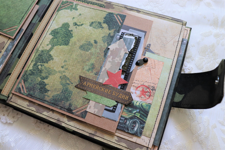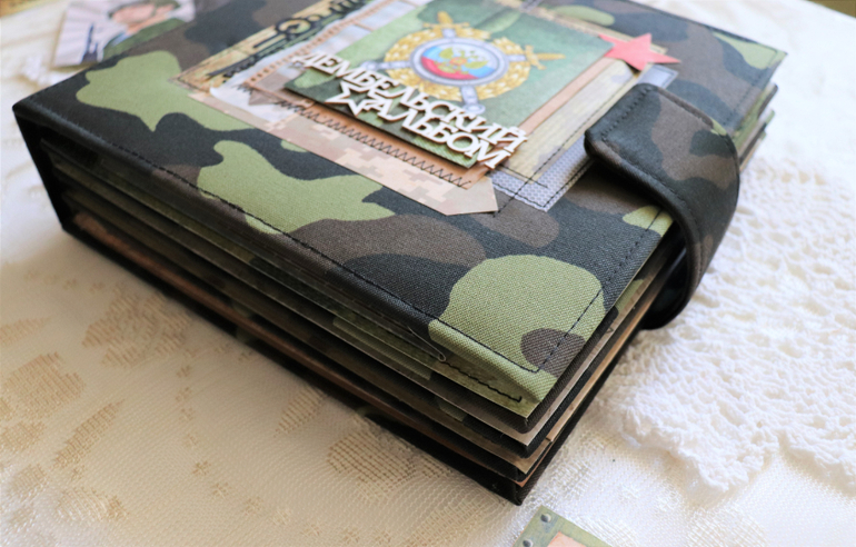 Обложка из переплетного картона обтянута камуфляжным плотным хлопком, закрывается на хлястик с магнитной кнопкой