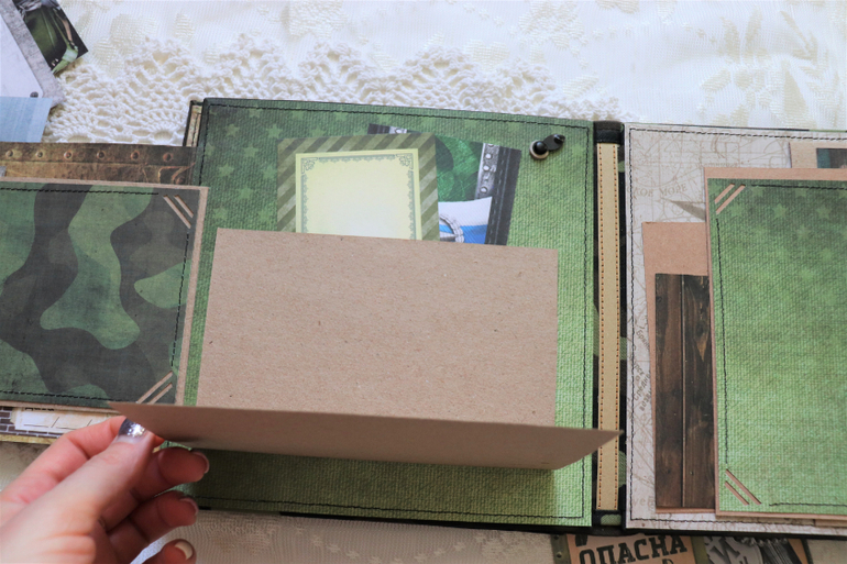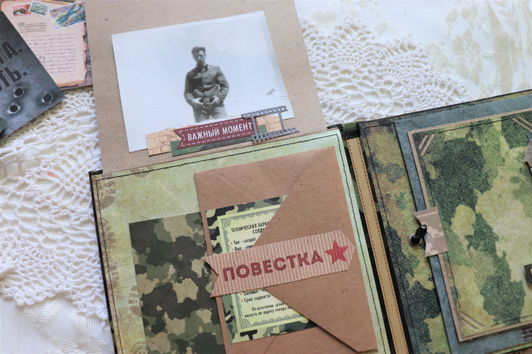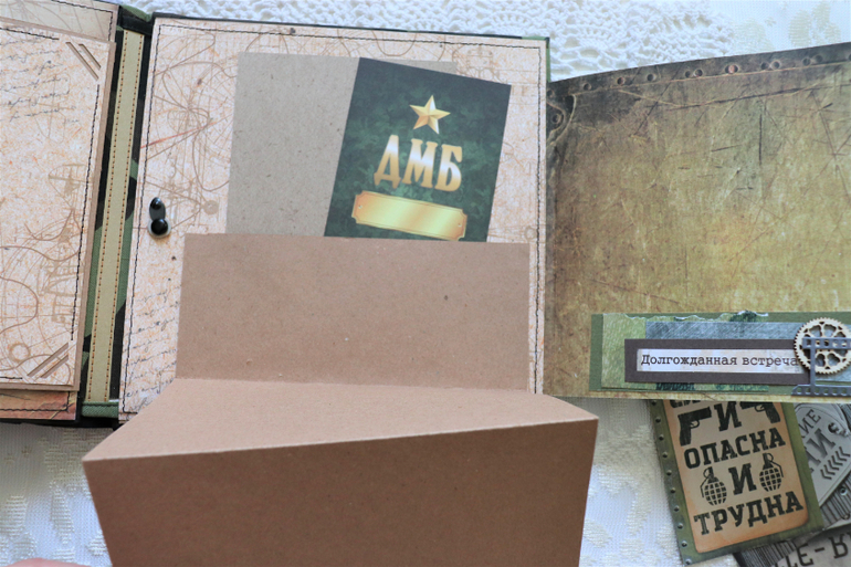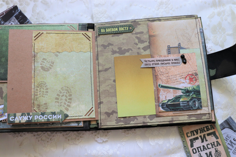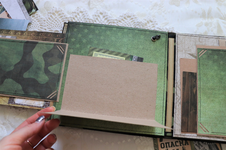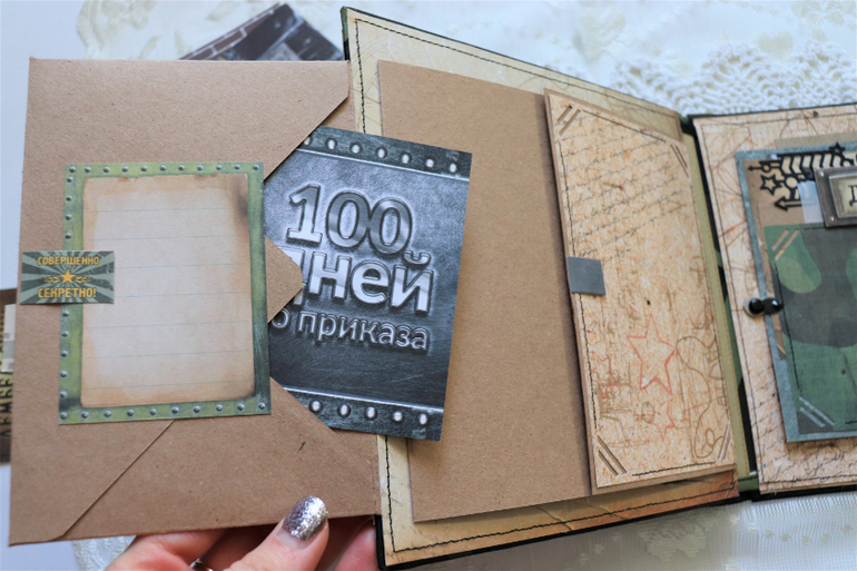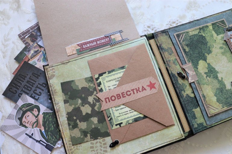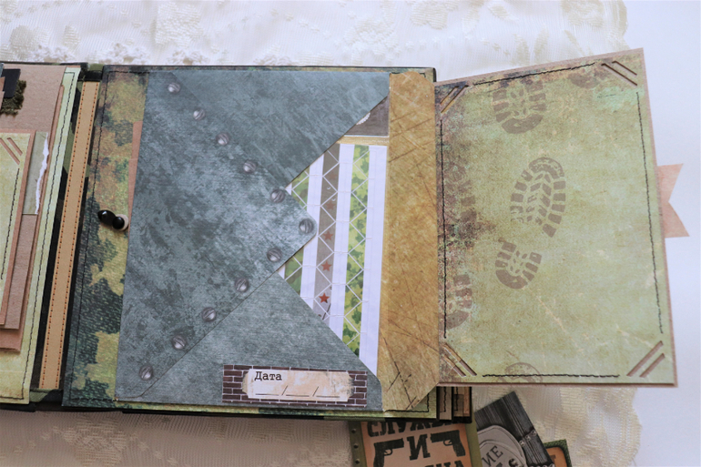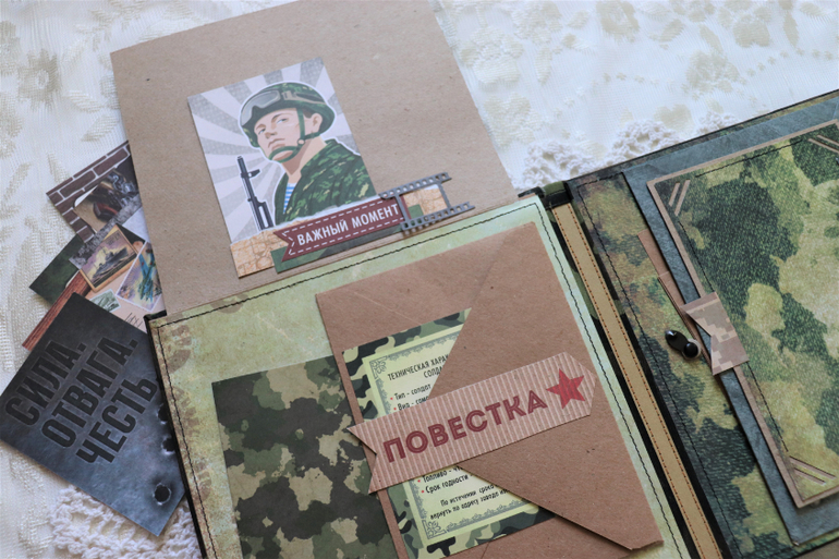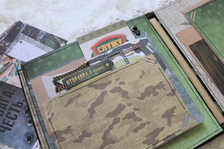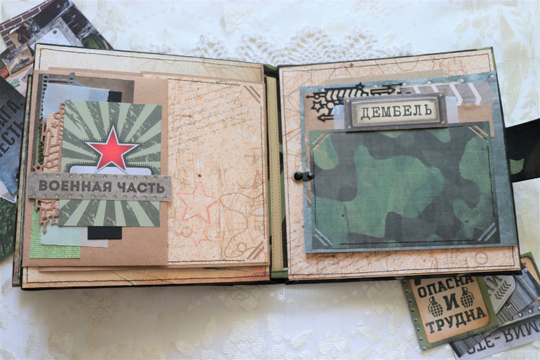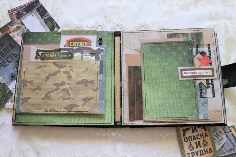 Обложка из переплетного картона обтянута камуфляжным плотным хлопком, закрывается на хлястик с магнитной кнопкой