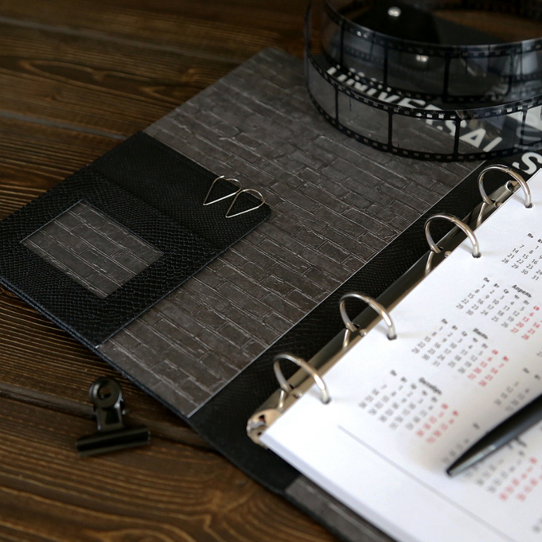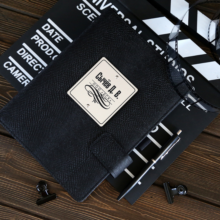 БлокнотыДоброго дня! Мужской блокнот на кольцах) С именным шильдом на обложке, линованный внутри. Есть крепление для ручки и вместительные кармашки.