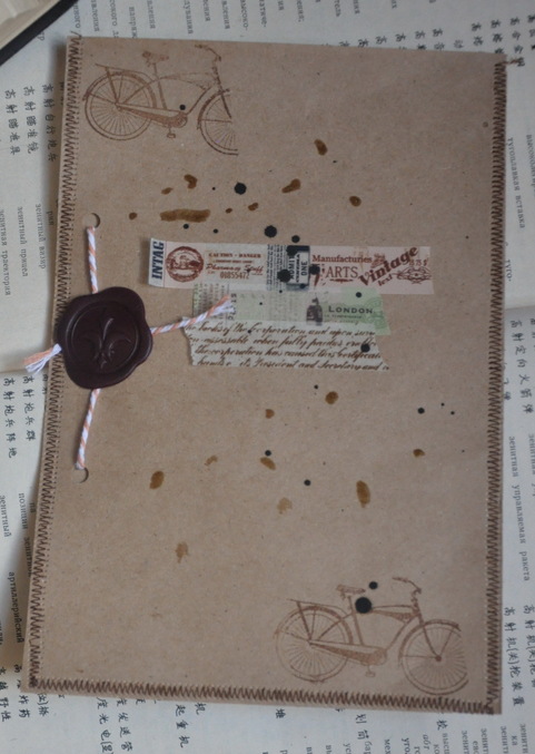 размер А5,обложка из кожи,на обложке и кожа нашита и исзнанки и так..и картинка покрытая акриловым лаком и сатинова наклейка велосипеда.....большая картинка это из бумаги вырезка Farm House Fair Skies Breeze плюс еще кусочек от График 45 и еще от какой-то....