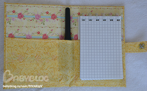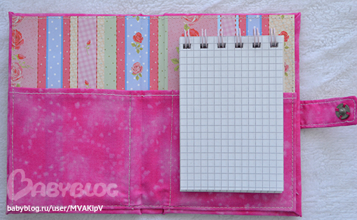 Закрывается на кнопку, блоки для записи можно менять, есть место для ручки, и кармашек для каких нибудь бумажек или чеков