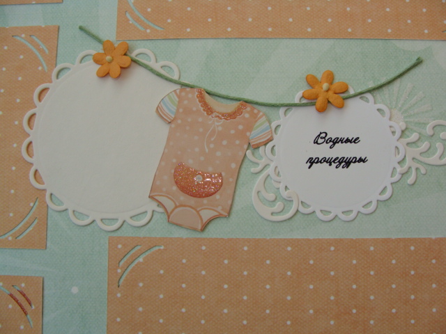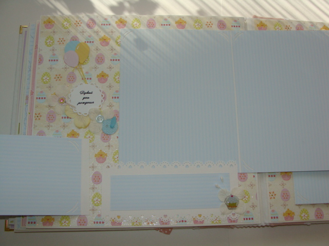 Седьмой разворот, тоже очень вместительный, на левой страничке умещается аж две фотки 15х20 см и 4 фотки 10х15 см, плюс место для записи про первый ДР малышки