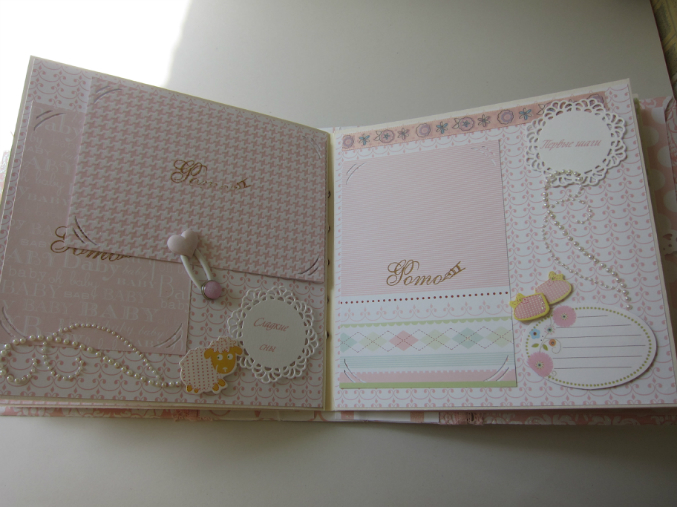 В альбомчике есть места для записи важных моментов, умелок малышки, теги и раскладушки! Есть место и для маленьких фото, и для фото 10 на 15. На обложке можно сделать любую надпись или написать имя хозяйки альбомчика!