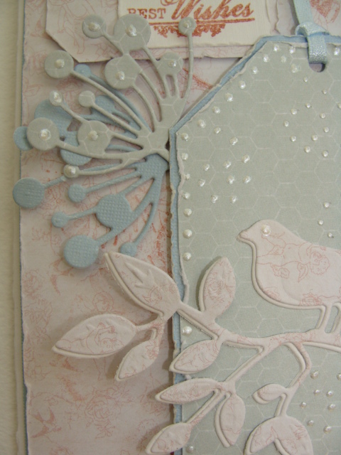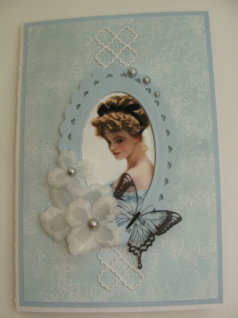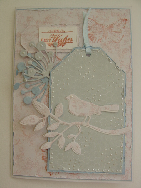 Бумажечка MF, штампы, жидкий жемчуг, вырубка, самодельные цветочки в технике пергамано (это вообще единственное, что я научилась делать в этой технике), полужемчуг... И вот что получилось...