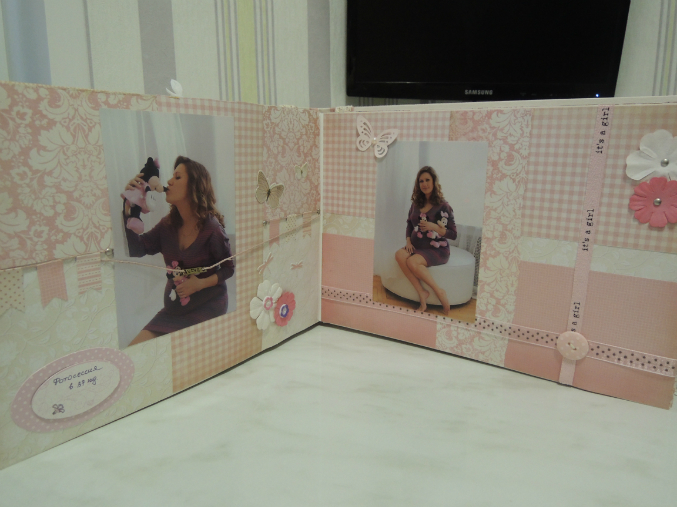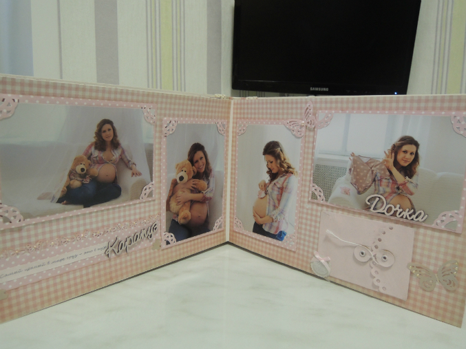 Далее идут фото разворотов. (7 шт) Жаль, но автоматически он их грузит в своем порядке((( Кое где сделаны разворотики - секретики там еще спрятаны фото. Есть кармашек для фото узи и тестика, для бирочки из роддома.