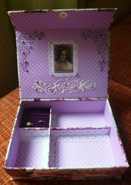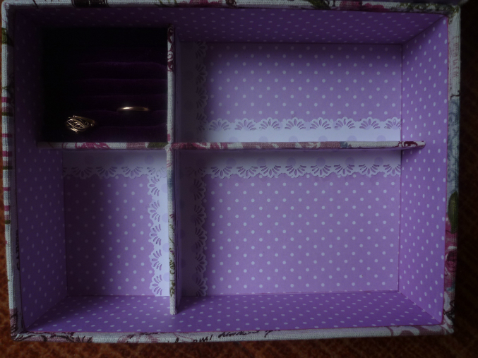 Отделение для колец: тонкий паралон, обшитый бархатом. Конечно с перегородками я помучалась, но осталась довольна.