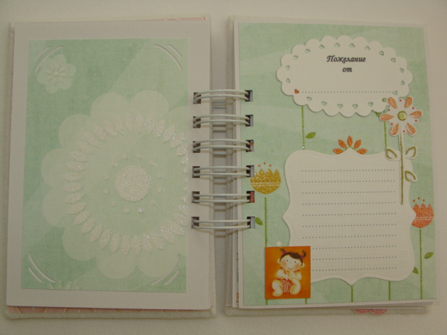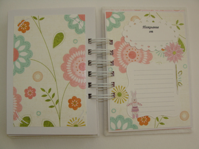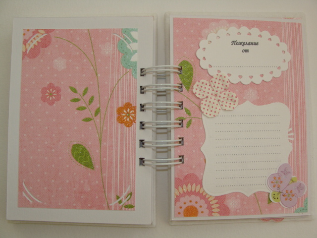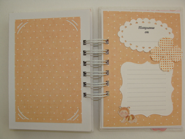 Книги пожеланий, чековые книжки, книжки желаний, кулинарные книгибыла сделана в дополнение к альбому http://www.babyblog.ru/community/post/newrukodelie/61697 в качестве подарочка, т.к. Даша мой постоянный заказчик. Альбомчик уже приехал к Даше и ее малышке, поэтому теперь могу показать и книжечку. Формат книжечки примерно А5, все странички оформлены из той же бумаги, что и сам альбомчик, каждый разворотик имеет место для самого пожелания и место для фото (ну, например, с фото малышки с тем, кто напишет на этом развороте пожелание, или просто фоточки с ДР малышки):