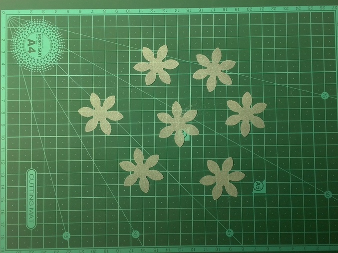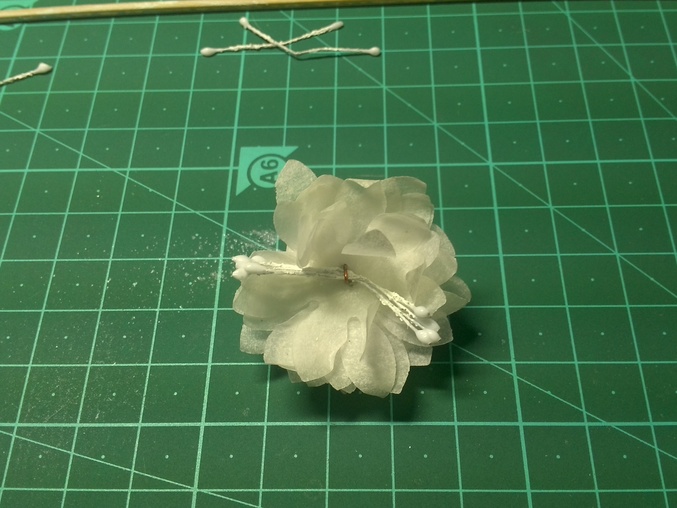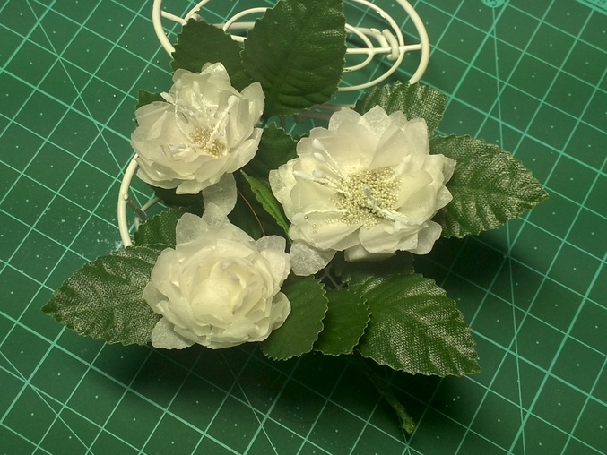 Также сделала вырубки в середине 1 цветка шилом сделала 2 дырочки продела согнутую проволоку, далее во всех остальных делала шилом в серединке только 1 дырочку нанизывала , не забывая к месту вдевания проволоки добавлять капельку клея для фиксации цветков. Вот что вышло