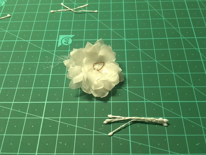 Далее мы приступаем к закреплению тычинок. Вытягиваем проволоку, делаем ушко и продеваем наши тычинки. Тянем проволоку вниз, и перекручиваем около основания снизу .