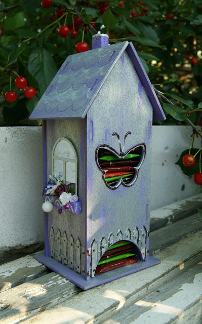 Очень шикарный домик вышел... Я просто в восторге, дооолго разглядывала.... Шикарно смотрится зеркальное окошечко с цветами на подоконнике, так уютно и тепло от него.... Ну и зацепил цвет, я же любитель всех оттенков фиолетового.