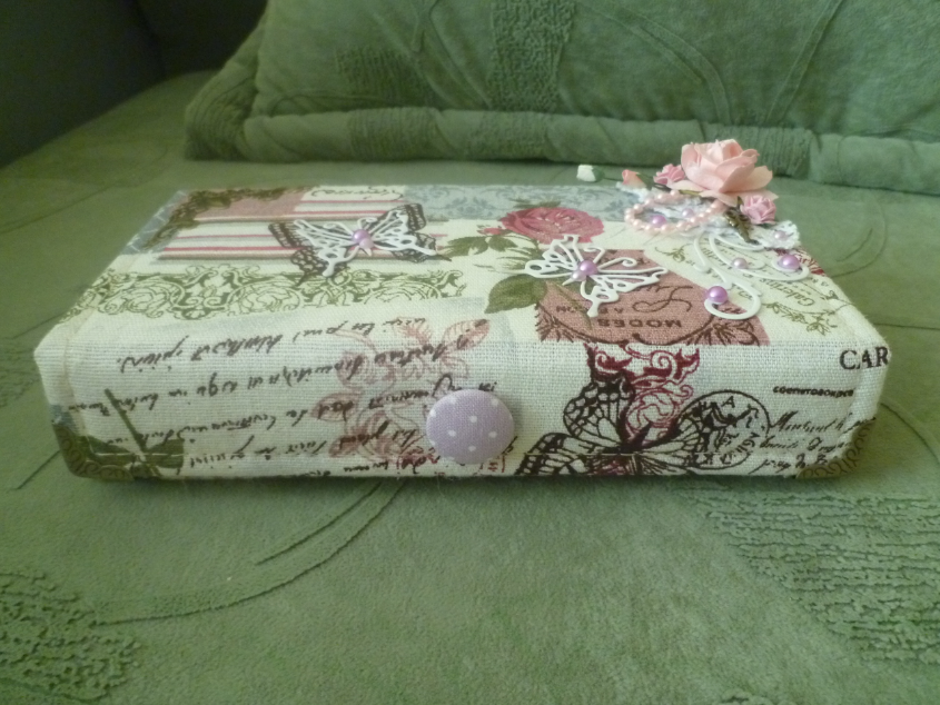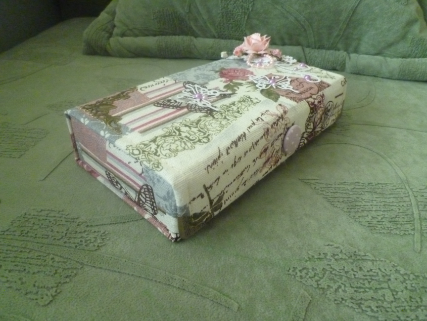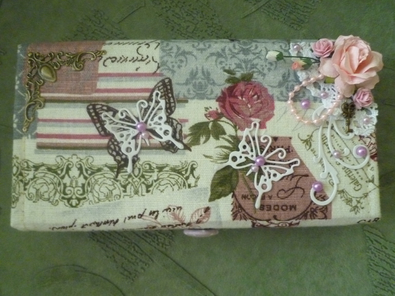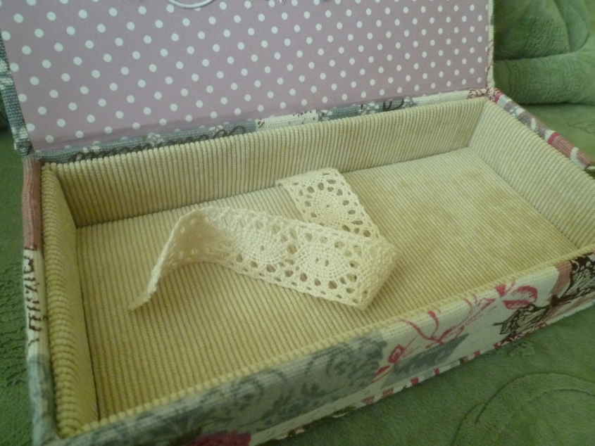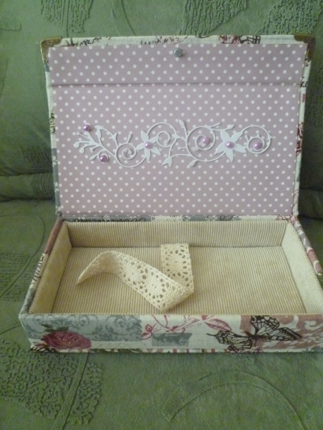 Это меня сподвигла девочка, кот. делала шкатулку для ювелирных изделий. Хотела она по-богатому внутри, следом она заказала эту купюрницу для мамы на 60летие. Сверху попросила бабочки и цветочки. Надо было мне ближе уголок с цветами подвинуть, слишком я его загнала((( Эх! Ну и внутри решила сделать по тому же принципу. Согласись. так смотрится красиво. А работы да, больше! На стенки я беру 4 картонки, обтягиваю вельветом, приклеиваю, с донышком также.
